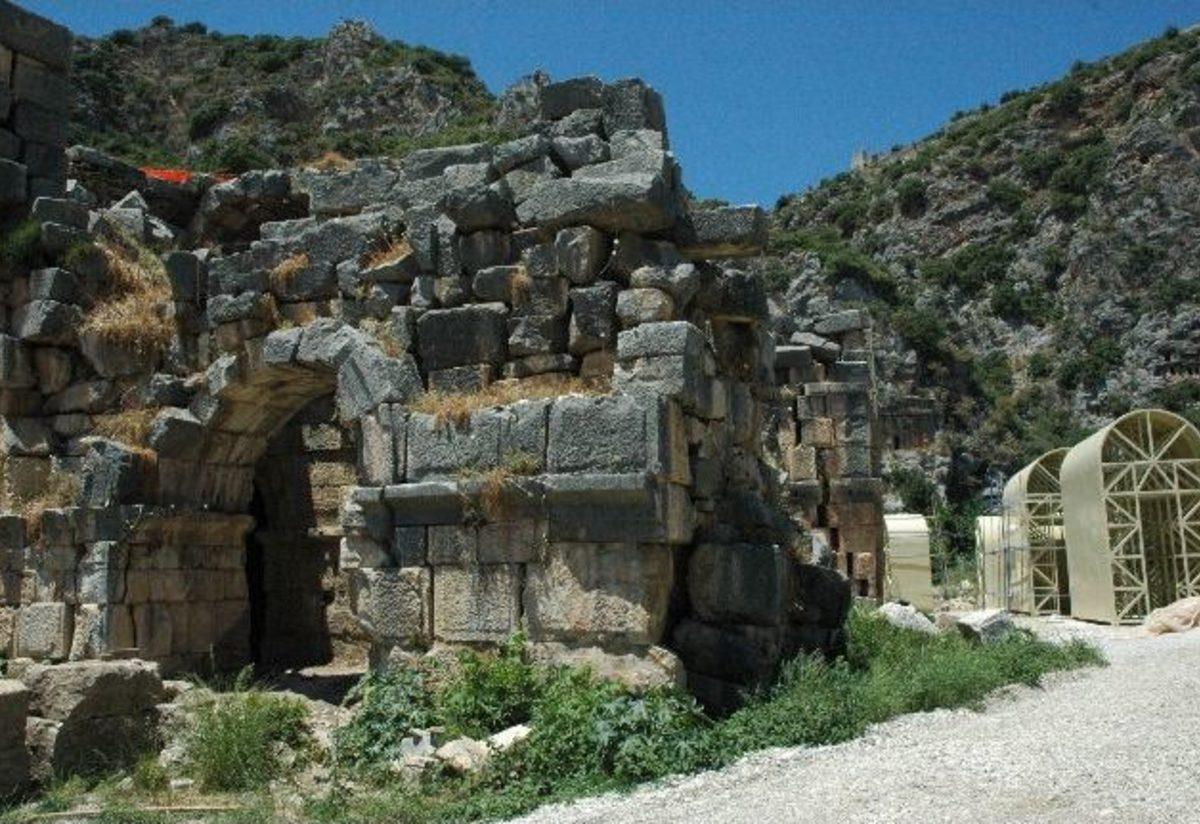 Antalya'nın Demre ilçesinde bulunan Myra Antik Tiyatrosu'nun doğu tonozları için yapılan 10'ar tonluk destekler tamamlanma aşamasına geldi.