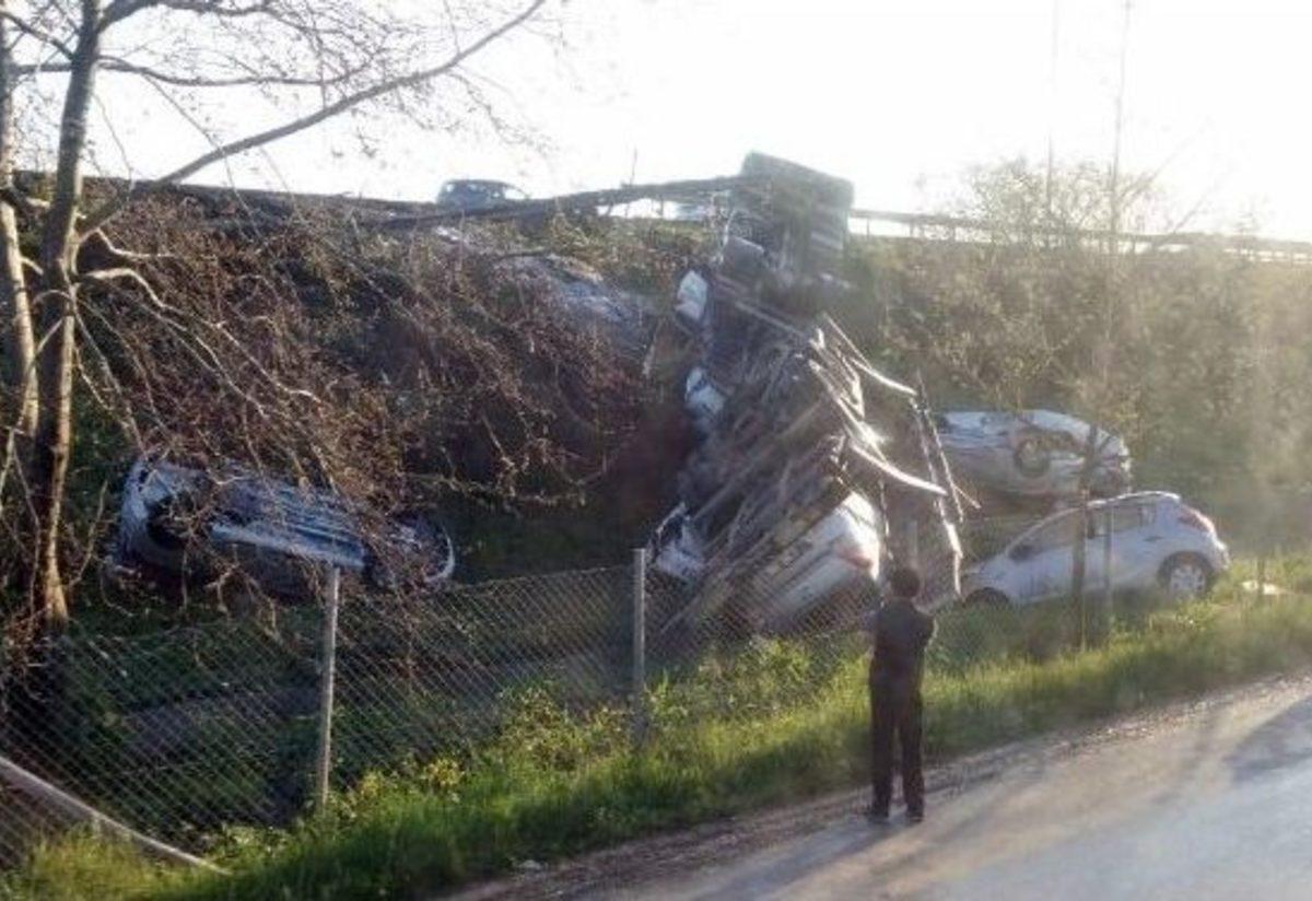 Kocaeli’nin İzmit ilçesi TEM otoyolundan araç yüklü TIR’ın devrilmesi sonucu 1 kişi yaralandı.Alınan bilgiye göre, İstanbul’dan yola çıkan ve TEM otoyolundan Ankara istikametine gitmekte olan Yasin İ. idaresindeki 34 UA 9625 plakalı araba yüklü bir TIR, TEM otoyolu İzmit Alikahya Köprüsü mevkiine geldiği sırada sürücüsünün direksiyon hakimiyetini kaybetmesi sonucu devrildi. Devrilen TIR’ın dorsesinde buluna sıfır araçlar TEM otoyolundaki bariyerleri aşarak yola savruldu. Kazada araçlarda maddi hasar meydana gelirken kazayı görenlerin haber vermesiyle olay yerine polis ve sağlık ekipleri sevk edildi. Kazada hafif şekilde yaralanan TIR sürücüsü sağlık ekipleri tarafından olay yerinde ayakta sağlık kontrolünden geçirildi. Devrilen TIR ve araçlar olay yerine gelen çekicilerle yoldan kaldırılırken kaza nedeniyle TEM otoyolunun Ankara istikametinde trafik kontrollü olarak verildi.Polis ekipleri kazayla ilgili soruşturma başlattı.