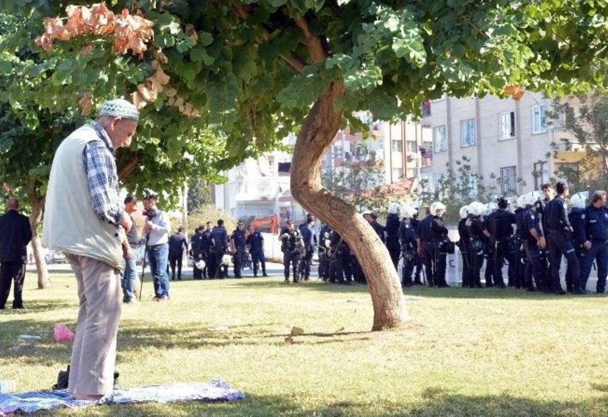 Antalya’da bir grubun HDP’li milletvekillerinin gözaltına alınmasını protestosu sırasında alanda öğle namazını kılan yaşlı adam...
