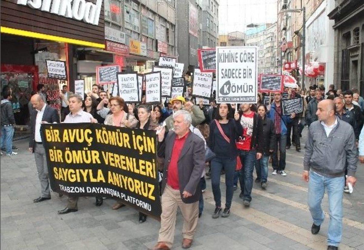 Trabzon’da, Soma’da meydana gelen maden faciasında hayatını kaybedenler için yürüyüş düzenlendi.Merkez Postane önünde toplanan Trabzon Dayanışma Platformu ve bazı sivil toplum örgütleri üyeleri, Atatürk Alanı’na yürüyerek maden faciasını protesto etti. Burada hayatını kaybeden maden işçilerinin anısına 1 dakikalık saygı duruşunda bulunuldu. Grup adına açıklama yapan Sinan Kutay, “Soma’da yaşanan facia yüzlerce canımızı aldı. 301 maden işçisi kardeşimiz bu faciada yaşamını yitirdi. Yaşanan katliama iş kazası denilip geçilemez. Bu bir katliamdır ve her katliamın bir sorumlusu vardır. Katliamın sorumluları daha 20 gün önce Soma’daki iş kazalarıyla ilgili araştırma önergesini reddedenlerdir” diyerek hükümeti istifaya çağırdı.Özelleştirilen madenlerin kamulaştırılması, emek ve meslek örgütlerinin denetimine açılması gerektiğini söyleyen Kutay, ayrıca taşeron çalışmanın yasaklanması ve katliamın sorumlusu şirket patronlarının cezalandırılması gerektiğini kaydetti.