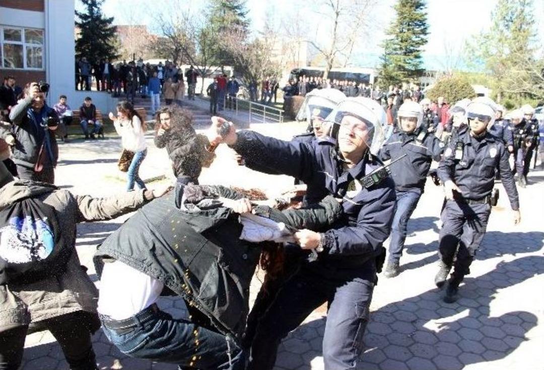 Anadolu Üniversitesi Yunus Emre Kampüsü merkez yemekhane önünde ve Edebiyat Fakültesi’nde bir grup öğrenci ile özel güvenlik ve Çevik Kuvvet ekipleri arasında afiş gerginliği yaşandı. Biber gazı ve kalkanların kullanıldığı olayda 2 öğrenci gözaltına alındı.Yunus Emre Yerleşkesi’nde bulunan yemekhane önünde toplanan yaklaşık 50 kişilik öğrenci grubu, Merkez Yemekhane cam ve duvarlarına çeşitli afişler astı. Bu afişlerin kaldırılmasını isteyen Özel Güvenlik Birimi’ne öğrenciler tepki göstererek afişlerin kaldırılmasına karşı çıktı. Daha sonra üniversite içerisine gelen Çevik Kuvvet ekipleri nezaretinde güvenlikler, burada bulunan afişleri söktü. Yemekhane önünde öğrenciler ile polis arasında sözlü münakaşa yaşanması sonucunda öğrenciler Edebiyat Faültesi’ne yöneldi. Bu esnada bazı öğrenciler, özel güvenlik görevlilerini protesto ederek, ellerinde bulunan afişleri gösterip, bunlarında alınmasını söyledi. Ardından fakülte içerisine giren öğrenci grubu, girişte bulunan otomatik kapıyı kapatarak, güvenlik görevlilerinin içeri girmesini engelledi. Farklı bir girişi kullanan çevik kuvvet ekipleri ise kapatılan kapıya gelerek öğrencileri uzaklaştırdı.Fakülte kantini içerisine giren öğrenci grubu, burada hem masa ve sandalyeleri kullanıp hem de kol kola girerek, barikat oluşturdu. Daha sonra öğrenciler, kantin camlarındaki afişleri de söken özel güvenlik görevlilerine yeniden tepki gösterdi. Bu tepkiler üzerinde Çevik Kuvvet ekipleri, öğrencilere biber gazı ve kalkanlarla müdahale etti. Öğrenciler de ekiplere, sandalye, soda şişesi, su şişesi atarak kantin dışarısına çıktı. Bu sırada da yaşanan biber gazlı müdahale sonucunda 2 öğrenci gözaltına alındı.Ardından, okulun çeşitli fakültelerine kaçan öğrencilerle polis arasında kovalamaca yaşandı. TOMA’nın da hazırda bulunduğu olay, öğrenci gruplarının dağılmasıyla sona erdi.