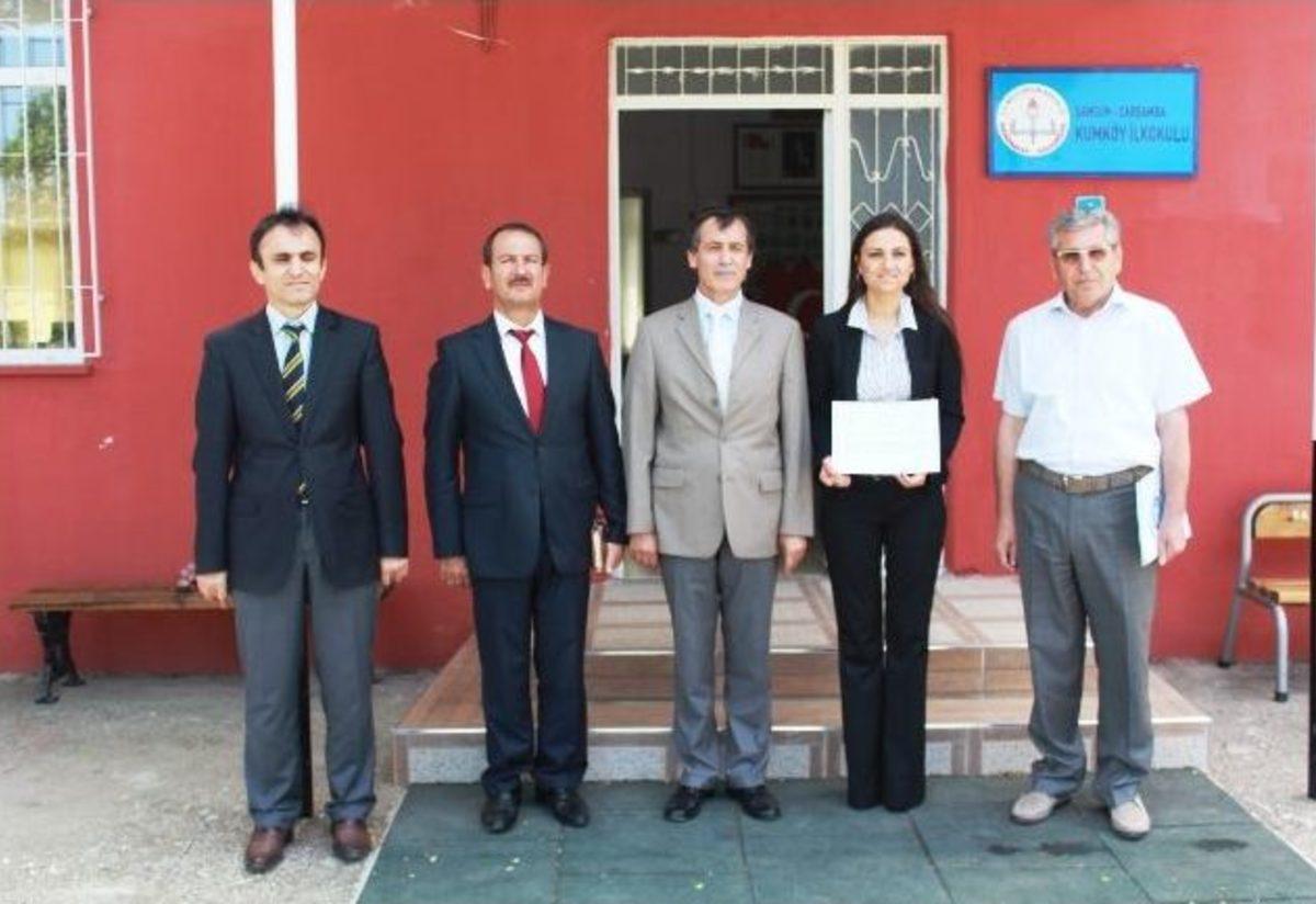 Samsun Milli Eğitim Müdürü Mustafa Cora, Çarşamba İlçe Milli Eğitim Müdürü Telat Aktaş ve İl Sağlık Müdürlüğü’nden temsilciler ile birlikte Kumköy İlkokulu’nu ziyaret eden ekip okul öğretmeni Dilek Livaneli’ye Beyaz Bayrak ile birlikte belgelerini sundu.