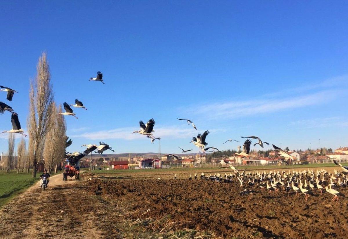 Yaz aylarına sayılı günler kala Afrika’dan sürüler halinde sıcak bölgelere uçan leylekler, Türkiye topraklarına göç etmeye başladı. Göç esnasında kanat çırpmadan kilometrelerce yol kat edebildikleri bilinen uzun gagalar, Eskişehir’in Çukurhisar beldesinde dinlenmek için kondukları boş bir tarlada objektiflere yansıdı. Siyah beyaz renkleri ve geniş kanatları ile görenleri hayran bırakan yüzlerce leylek, havada olduğu gibi karada da görsel şölen oluşturdu.