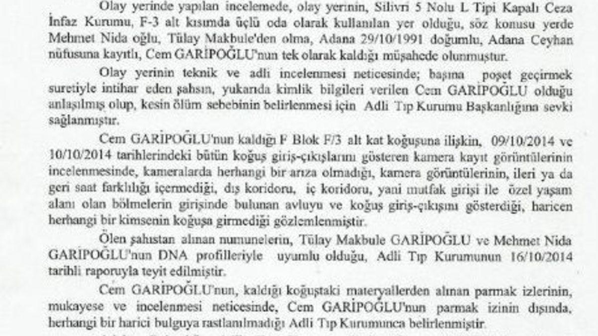 Silivri Cumhuriyet Başsavcılığı, Cem Garipoğlu’nun başına poşet geçirerek intihar ettiğini ve o tarihte kayıt alan kameralarda herhangi bir arızanın olmadığını bildirdi.Silivri Cumhuriyet Başsavcısı Lütfi Dursun, Cem Garipoğlu’nun kesin ölüm nedenini yazılı bir bildiri ile açıkladı. Dursun, "Adalet Bakanlığı Adli Tıp Kurumu otopsi raporuna göre, başa poşet geçirilmesine bağlı, ağız burun kapanması ve boyna bağ tatbikine bağlı, mekanik asfiksi sonucu meydana gelmiş olduğu sonucuna ulaşılmıştır" dedi.Açıklamada, Garipoğlu’nun başına poşet geçirerek intihar ettiği ve o tarihte kayıt alan kameralarda herhangi bir arızanın olmadığı ifade edildi. Detaylı bilgilerin verildiği açıklamada, olay sırasında kamera görüntülerinin ileri ya da geri saate sarılmadığı ve koğuşa da kimsenin girmediğinin kesin olarak görüntülendiğine dikkat çekildi.Münevver Karabulut’un katili Cem Garipoğlu, hapis cezasını çektiği Silivri 5 Nolu L Tipi Kapalı Cezaevi’nde intihar etmişti.