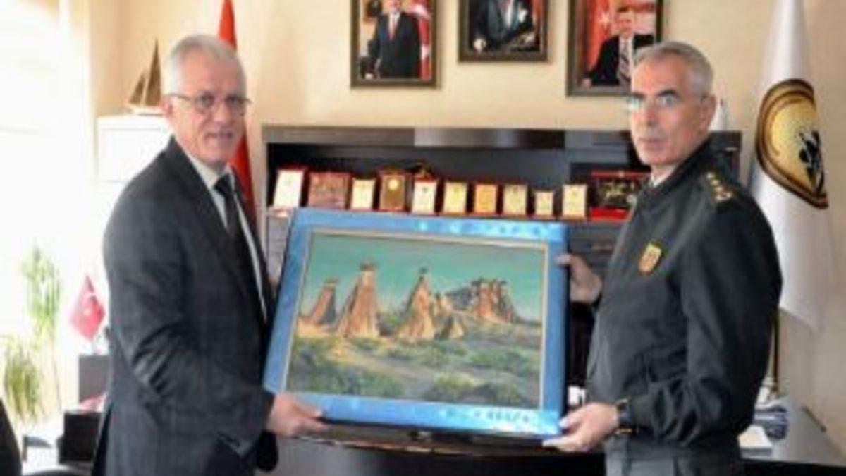 Göreme Belediye Başkanı Nuri Cingil ziyarette İl Garnizon ve Jandarma Komutanı Jandarma Kıdemli Albay Dursun Ertuğrul'a Göreme'nin manzarasının yer aldığı bir yağlı boya tablo hediye etti.