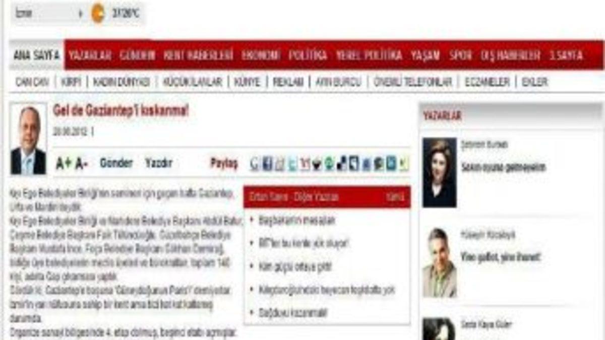 Yazısında Gaziantep’ten övgüyle bahseden Sayın, “6 yıl önce gittiğim Gaziantep ile geçen hafta gittiğim Gaziantep arasında dağlar kadar farkı görünce aklıma 8 yıl aradan sonra İzmir'e gelen bir dostumun 'Bu kent hiç mi değişmez' sözü geldi. Yerinde sayıyor İzmir. Saymaya da devam ediyor. Gaziantep Büyükşehir Belediye Başkanı her salı ve cuma günü sabahın 7'sinde üst düzey bürokratlarıyla biniyor minibüse, kenti dolaşıyor, yapılanlara, yapılmayanlara bakıyor. Her pazartesi sabah 7'de üst düzey bürokratları ve daire başkanlarıyla toplanıp iş programı yapıyor. Cuma akşamı da o iş programının raporunu alıyor. Bizim kentte üst düzey bürokrat başkanı göremiyor, derdini anlatmaya çekiniyor. Bu anlayış başarı getirmez yerinde saydırır.”