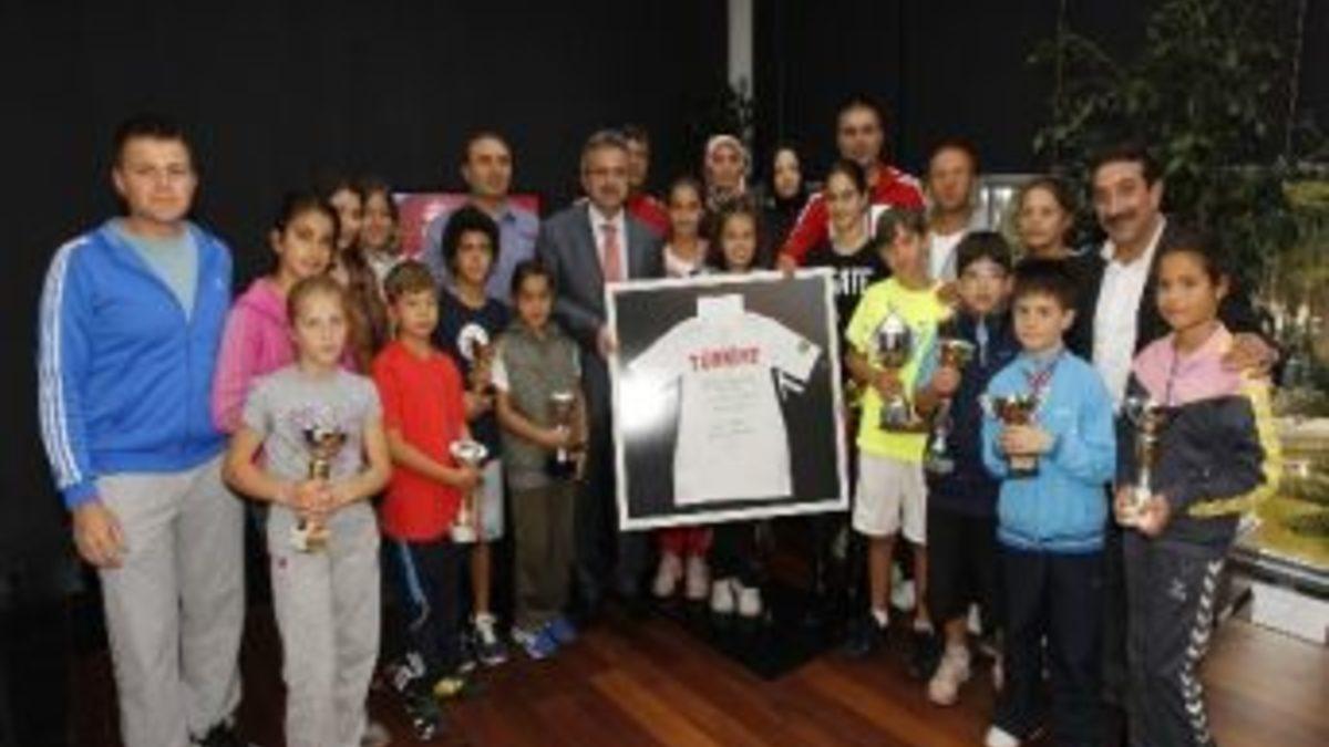 Gebze’nin altın raketleri Başkan Köşker’i ziyaret etti. Katıldıkları Türkiye Tenis Turnuvası’nda aldıkları derecelerle Gebze’nin adını altın harflerle yazdıran genç tenisçiler Gebze Belediye Başkanı Adnan Köşker’e konuk oldu. Gebze Kent Meydanı’nda bulunan başkanlık ofisinde gerçekleştirilen ziyarete 9-14 yaş gruplarında dereceye giren Gebzeli tenisçiler Betina Tokaç, Hilal Deniz, Neslihan Demirci, Emin Türk, Ayşenur Merve Koşar, İsmail Ata Çankaya, Togan Tokaç, Elif Başaran, Betül Sular, Melisa Kaya, Mert Güngör, Atakan Karahan, Zeynep Sular, Özlem Uslu, Gebze Tenis Kulübü Başkanı Ali Tokaç, antrenör Hikmet Saraç, Serkan Aslan ve sporcu velileri katıldı.Sporcuların ziyaretinden duyduğu memnuniyeti dile getiren Gebze Belediye Başkanı Adnan Köşker, “Genç sporcularımızla, bu güzide evlatlarımızla ne kadar gurur duysak az. Kendilerini yetiştiren hocaları başta olmak üzere, Gebze’mizin adını altın harflerle yazdıran gençlerimizi tebrik ediyorum. Başarılarının devamını diliyorum” dedi. Genç sporcuların ziyareti, 12 Yaş Tenis Milli Takım oyuncusu Betina Tokaç’ın Başkan Köşker’e Milli Takım forması hediye etmesiyle sona erdi.