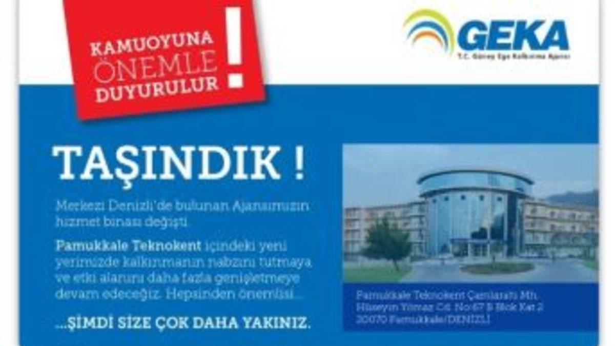 Aydın, Denizli ve Muğla illerinin kalkınması için faaliyetlerini sürdüren ve merkezi Denizli’de bulunan Güney Ege Kalkınma Ajansı (GEKA) 2010 yılından bu yana hizmet verdiği EGS Park Kongre ve Kültür Merkezi’ndeki binasından, Pamukkale Teknokent Hizmet Binası’na taşındı.Adres değişikliği nedeniyle, 9 Şubat 2015 tarihinde GEKA tarafından ilan edilen Alternatif Turizm, Üretim ve Ticaret Altyapısının Geliştirilmesi ile Yenilenebilir Enerji alanlarındaki 2015 yılı Mali Destek Programlarına proje başvurusu yapacak paydaşların dosyalarını Ajansın, “Güney Ege Kalkınma Ajansı, Pamukkale Teknokent Çamlaraltı Mh. Hüseyin Yılmaz Cd. No:67 B Blok Kat:2 20070 Pamukkale/DENİZLİ” adresine teslim etmeleri gerektiği açıklandı. Ayrıca yatırım danışmanlığı, yatırım izleme, yatırımcıların idari işlemleri ve bölgeye yatırımcı çekmeğe yönelik çalışmalarını sürdüren GEKA Denizli Yatırım Destek Ofisi de Teknokent Hizmet Binası B Blok giriş katı 8 numaralı odada yatırımcılara hizmet vereceği belirtildi.