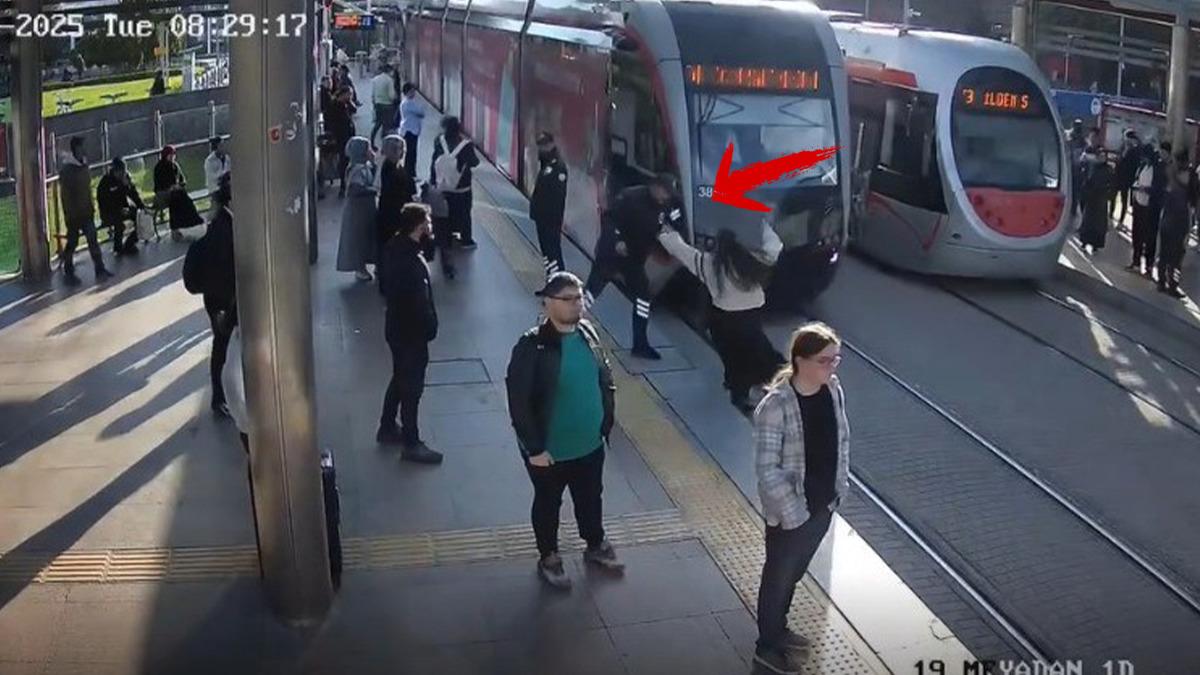 Durumu fark eden güvenlik görevlileri genç kızı çekerek tramvayın altında kalmaktan son anda kurtardı. Olay, güvenlik kamerası ve tramvay içi kamera tarafından saniye saniye kaydedildi.