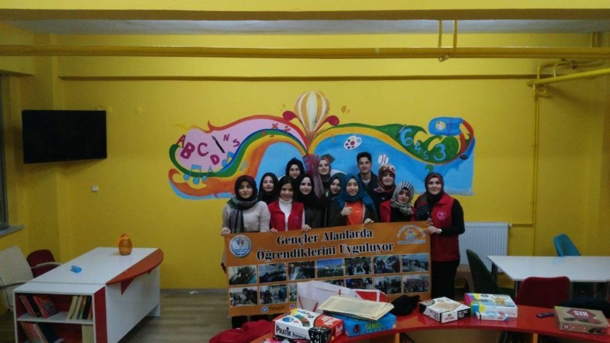 Ordu’nun Fatsa Gençlik Merkezi Güzel Sanatlar Kulübü öğrencileri Çamaş ilçesinde bulunan Edirli Kocaman İlköğretim Okulunun kütüphanesinin duvarlarını renklendirdiler.