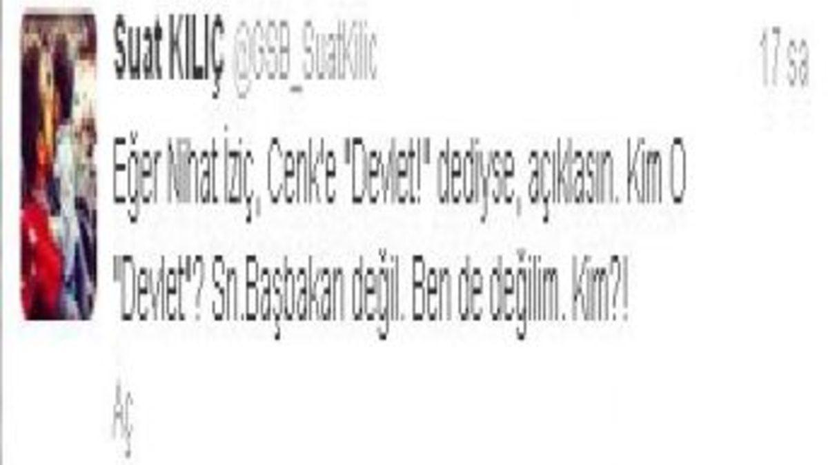 Konuyla ilgili tartışmalara cevap veren Kılıç, "Eğer Nihat İziç, Cenk'e 'devlet' dediyse, açıklasın. Kim o 'devlet?' Sayın Başbakan değil ben de değilim. Kim?" tweetini paylaştı.
