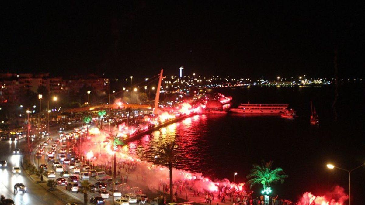 Göztepe’nin 88. yıl dönümünü kutlamak için Güzelyalı Vapur İskelesi’nde toplanan sarı-kırmızılı taraftarlar, ellerindeki meşalelerle uzun süre takımları lehinde tezahüratta bulundu.