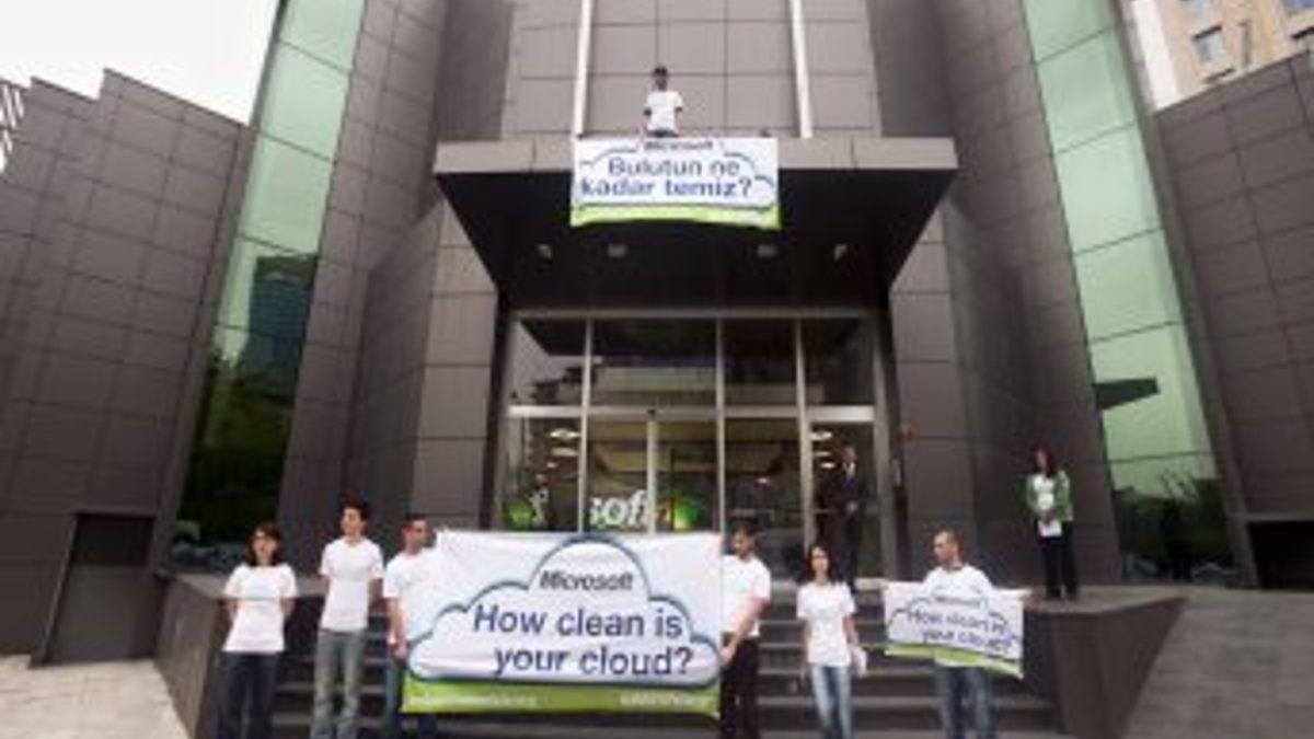 Greenpeace üyesi 8 kişi, sabah saat 07.30 sıralarında Beşiktaş Levent Aydın Sokak'ta bulunan Microsoft'un binasının önüne geldi. Yazılım şirketlerinin veri merkezinde kullandığı enerjiyi kömür ve nükleer gibi enerjilerden sağlayıp doğa kirliliğine yol açtıklarını ileri süren Greenpeace üyeleri, beraberinde getirdikleri seyyar merdivenle şirketin girişindeki yüksek bölüme tırmanmaya çalıştı. Bir eylemci yukarı çıktıktan sonra şirketin özel güvenlik elemanları duruma müdahale etti. Eylemcilerden birini merdivenle tırmanırken paçasından yakalayan güvenlik görevlisi, aşağıya indirdi. Şirketin girişindeki yüksek bölüme çıkan eylemci ile şirketin girişinde bulunan arkadaşları, Türkçe ve İngilizce, "Microsoft Bulutun ne kadar temiz" yazılı pankart açtı. Sabah işyerlerine gelen şirket çalışanları ise eylem karşısında şaşkınlık yaşadı.