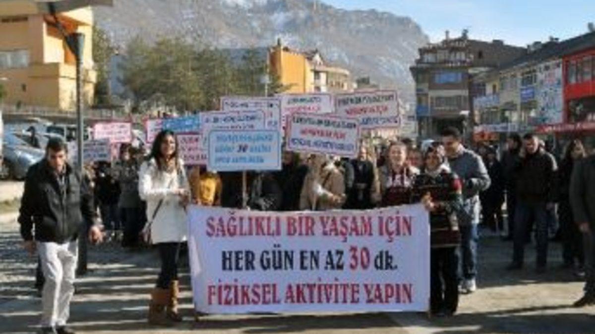 Gümüşhane’de “Sevdiklerimizle Sağlığa Yürüyoruz” temalı yürüyüş düzenlendi. Davul-zurna eşliğinde gerçekleşen yürüyüşün sonunda sporculara kasa kasa mandalina ikram edildi.Sağlık Bakanlığı’na bağlı İl Sağlık Müdürlüğü, Halk Sağlığı Müdürlüğü ve Kamu Hastaneleri Birliği Genel Sekreterliği işbirliğinde fiziksel aktiviteye dikkat çekmek için gerçekleştirilen etkinliğe Belediye Başkanı Mustafa Canlı, İl Sağlık Müdürü Dr. Emre Boşnak, Halk Sağlığı Müdürü Dr. Engin Pehlivan, Kamu Hastaneleri Birliği Genel Sekreteri Op.Dr. Aziz Ahmet Surel, CHP İl Başkanı Atilla Sait Özdamar, CHP Belediye Başkan Adayı Cem Köksal, kamu kurum müdürleri ve vatandaşlar katıldı.Halk oyuncularının da katıldığı yürüyüşün başlangıç noktası olan Zafer Meydanında toplanan vatandaşlar, burada davul-zurna eşliğinde bir müddet halk oyunları oynadıktan sonra yürüyüşe başladı. Atatürk Caddesi, Cumhuriyet Caddesi ve Hasanbey Caddesini takiple devam eden yürüyüş Toplum Sağlığı Merkezi önünde sona erdi.Gençlerin ellerinde ki pankartlar ve davul-zurna eşliğinde gerçekleştirilen yürüyüşte evlerindeki vatandaşlar balkon ve pencerelere akın ederken yürüyüşün sonunda katılımcılara kasalarla mandalina ikram edildi.EN SIK GÖRÜLEN HASTALIKLARIN BAŞLICA SEBEBİ: OBEZİTEProgramın sonunda gazetecilere açıklamalarda bulunan Halk Sağlığı Müdürü Dr. Engin Pehlivan, obezitenin vücutta kilo artışı olduğunu belirterek, en önemli nedenlerinin düzensiz ve dengesiz beslenme ile hareketsizlik olduğunu, günümüzde de en sık görülen hastalıkların başlıca sebebinin obezite olduğunu söyledi.2014 YILI SAĞLIKLI YAŞAM VE HAREKET YILI İLAN EDİLDİSağlık Bakanlığının 2014 yılını “Sağlıklı Yaşam ve Hareket Yılı” olarak ilan ettiğini ifade eden Pehlivan, “Bu vesile ile bizde “Sevdiklerimizle Sağlığa Yürüyoruz” temalı yürüyüş programları ile halkımızla birlikte obezite ve fiziksel aktiviteye dikkat çekmek, bilgilendirmek ve bilinçlendirmek, farkındalık oluşturmak amacıyla bu etkinliği düzenledik. Bu tür etkinliklerimiz yıl boyunca devam edecek. Amacımız sürekli bilgilendirme, bilinçlendirme ve farkındalık oluşturmaktır.” dedi.“SAĞLIKLI YAŞAM İÇİN GÜNDE EN AZ 30 DAKİKA YÜRÜYÜN”Vatandaşlara sağlıklı bir yaşam için düzenli ve dengeli beslenmeyi öneren Pehlivan, her bireyin günde en az 30 dakika veya 10 bin adım yürüyüş yapmasının kendi sağlığı açısından son derece önemli olduğunun altını çizerek, velilerden de çocuklarını özellikle sokak oyunlarına, halk oyunları gibi içerisinde hareket bulunan oyunlara teşvik etmelerini istedi.