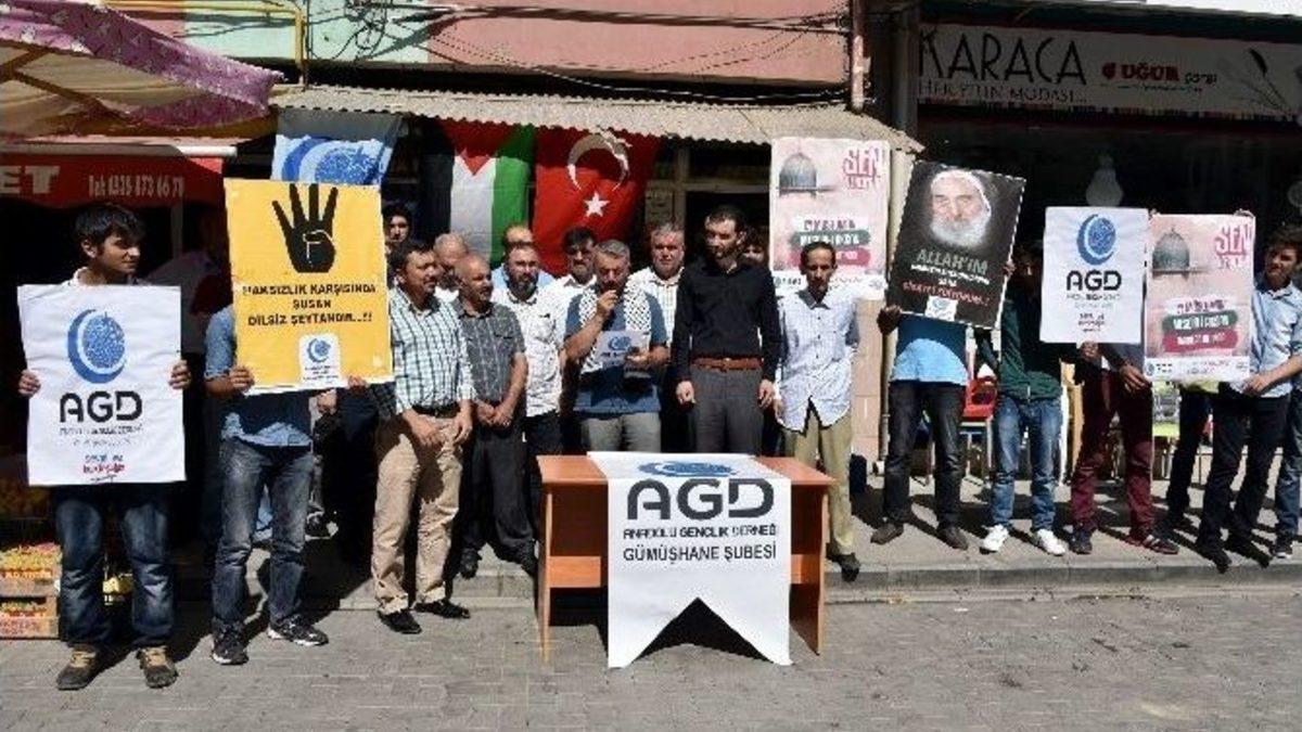 İsrail askerlerinin Müslümanların ilk kıblesi olan Mescid-i Aksa’da gerçekleştirdiği işgal Gümüşhane’de protesto edildi.Anadolu Gençlik Derneği (AGD) Gümüşhane Şubesi tarafından Cuma namazı çıkışı Kemaliye Camisi önünde basın açıklaması yapan bir grup, “Oluk oluk kan aksa, kurtulacak el-Aksa”, “Kahrolsun İsrail”, “Müslüman uyuma kardeşine sahip çık” sloganları attı.AGD Gümüşhane Şube Başkanı Naci Şenel, burada yaptığı açıklamada, terör devleti İsrail’in müslümanlara yönelik saldırı ve kışkırtmalarına sitemli bir şekilde devam ettiğini belirterek, “Yahudi takviminde yılbaşı kabul edilen Roş Aşana bahanesiyle, beş gündür Mescid-i Aksa’ya yönelik yapılan işgal ve saldırılar, Filistin topraklarını Müslümanlardan arındırma politikalarının bir parçasıdır. Siyonist İsrail, her zaman olduğu gibi uluslararası anlaşmaları hiçe saymaktadır. Mescid-i Aksa bir İslam mabedidir. Buna rağmen terör devleti İsrail, Mescid-i Aksa’yı belirli zamanlarda Yahudilere tahsis etmek istemektedir” dedi.Mescid-i Aksa’ya müslümanların girmesini silah zoruyla engelleyerek, yine silahlı unsurların eşliğinde Yahudilerin Mescid-i Aksa’ya sokulması, Mescid-i Aksa’yı Müslümanların elinden almaya yönelik bir politikanın adım adım işletilmesi olduğunu savunan Şenel, “Terör devleti İsrail’in amacı ilk fırsatta Mescid-i Aksa’nın hukuki statüsünü değiştirmek ve burayı Yahudilerle Müslümanlar arasında bölmektir. Filistin topraklarını Müslümanlardan arındırmayı bir devlet politikası haline getiren İsrail, Doğu Kudüs’ü ve Mescid-i Aksayı da İslam’dan koparabilmek için her türlü yola başvurmaktadır. Efendimiz (sas), “Mescid-i Aksa’ya gidin ve içinde namaz kılın. Eğer oraya gidemez ve içinde namaz kılamaz iseniz kandillerinde yakılmak üzere oraya zeytinyağı gönderin” buyurmuşlardır. Elbette burada zeytinyağı bir semboldür. Efendimiz(sas) henüz o zaman için fethedilmemiş Kudüs’ün ve Mescid-i Aksa’nın önemini bildirmek bu hadisi beyan etmiştir. Zeytinyağı bir semboldür. Bize düşen tarih boyunca vahyin, tebliğin ve mücahedenin merkezi olmuş bir beldeye sahip çıkmak, oranın bir İslam şehri olması için her türlü desteği o topraklara vermektir. İşte biz bugün Mescid-i Aksa’nın kandillerine zeytinyağı damlatmak, Kudüs’ün semalarına dua göndermek, Filistinli Müslüman kardeşlerimizin yüreklerine su serpmek için buradayız” diye konuştu.Şenel, temenni, dua ve gayretlerinin akan kanın durması, gözyaşlarının dinmesi, yapılan ihlallerin son bulması ve zulmün engellenmesi için olduğunu söyleyerek açıklamasını sonlandırdı.