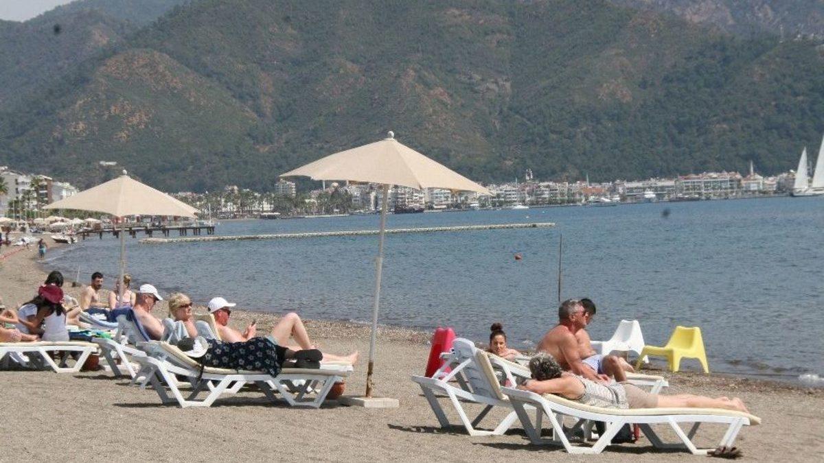 Muğla’nın gözde turizm merkezlerinden Marmaris’te güneşli havayı fırsat bilen turistler sahilde güneş ve denizin keyfini çıkardı.Bahar mevsimiyle birlikte Güney Ege’de hava sıcaklıkları da artmaya başladı. Muğla’nın göze turizm merkezi Marmaris’te hava sıcaklığı 22 derece ölçüldü. Paskalya tatili nedeniyle ilçede bulunan İngiliz turistler sıcak havayı fırsat bilip kendilerini sahile attılar. Deniz suyu sıcaklığının 17 derece ölçüldüğü ilçede bazı turistler denize girerken bazıları da sahilde güneşlenmeyi tercih etti.Nevruz tatili için ilçeye gelen Arap turistlerin ise su sporları yaparak tatilin keyfini çıkardığı görüldü.Marmaris Meteoroloji Müdürlüğünden alınan bilgiye göre, sıcak havanın hafta sonunda da etkili olacağı öğrenildi.