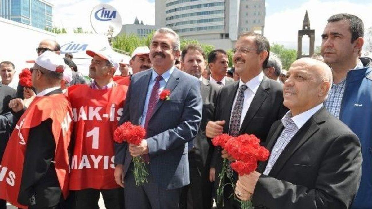 Hak-İş Konfederasyonu 1 Mayıs'ı Kayseri'de coşkuyla kutladı.Hak-İş’in Kayseri’de düzenlediği 1 Mayıs kutlamasına, Hak-İş Genel Başkanı Mahmut Aslan, Kayseri Büyükşehir Belediye Başkanı Mehmet Özhaseki, Memursen, Eğitim-Bir-Sen, Kimder, Kuder, Hilalder, Miraç Kültür Vakfı, Kayseri Gönüllü Kültür Kuruluşları, Kayseri Ticaret Odası Başkanı Mahmut Hiçyılmaz ile çok sayıda işçi ve memur temsilcisi katıldı.Hak-İş Genel Başkanı Mahmut Aslan, “Tüm dünya emekçilerine selam olsun. Emeğin onurunu her şeyin üstünde tutan insanlık onurunun değerli temsilcileri. Bu gün Selçuklu’nun Osmanlı’nın gözbebeği Kayseri’deyiz. Kayseri bu gün daha coşkulu, Erciyes bu gün daha ak, daha parlak. Kayseri 1 Mayıs’ta seni tarih yazıyor.Emekçiler, Kayseri’den tüm Türkiye’ye haykırıyorum. Hak-iş olarak bu gün Kayseri’deyiz. İşte 1 Mayıs, işte alanlar. Bütün 1 Mayıs kutlamaları bu gün buradaki gibi barışçıl olsun. Diyarbakır’a, İstanbul’a dostlarımıza selam olsun diyoruz.Derdimiz, davamız var onun için buradayız. Bu gün onurunu, emeğini, erdem ve mücadelesini her şeyin üzerinde tutan emekçilerin günü. İşsizler, haksızlığa uğramışlar, yetimler, engelliler, emekliler bu gün sizin gününüz. Bu gün emekçi kadınların günü. Bu gün terlemenin, ter ve emeğin günü.Değerli mücadeleci arkadaşlarım. Taşeronlaşmaya hayır diyoruz, mevsimlik işçilerin sorunu çözülsün diyoruz. Kamuya kadrolu işçi alınsın diyoruz.Örgütsüzlüğü, kuralsızlığı tetikleyen, taşeron işçilerin sorunları çözülmeli. Sendikalaşmanın önü açılmalı. Taşeron işçilerin haklarının güvence altına alınmasını istiyoruz. Kamudaki statü karmaşasına son verilmeli. Kayseri’den yılmadan usanmadan haykırıyoruz. Mevsimlik işçilerin sorunları, 4C’lilerin sorunları çözülmeli. Gerçekçi bir norm kadro sisteminin oluşmasını istiyoruz. Daha çok istihdam, daha çok üretim ve daha güçlü bir Türkiye için bu gün alanlardayız.Gerçek iş güvencesi için, eşitlik ve adalet talebimiz için, kayıt dışına son verilmesi için, gelir adaletsizliğine itiraz ettiğimiz için alanlardayız. Bu gün umutlarımızı ortaklaştırmak, sorunlarımızı haykırmak için, hayatlarının baharında iş başında kaybettiklerimiz için alanlardayız. Bu arkadaşlarımızı rahmetle anıyoruz. İş kazalarında Avrupa birincisiyiz. Bunu hangi vicdan kabul eder. İş sağlığı ve güvenliği önlemleri daha çok artırılmalı. Sendikalaşmanın önü açılmalı. İtirazımız var, isyanımız var. Bitsin artık bu cinayetler. Devlete, hükümete ve işverenlere sesleniyorum. Bu sorunu lütfen çözün.İşçilerin, memurların, esnafın, emeklilerin, işsizlerin, engellilerin, kadınların sorunlarına çözüm bulunsun diye alanlardayız.Sendikalar öcü değil, rakip değil, düşman değil. İşverenler önyargılarınızı bir kenara atın, bizi dinleyin. Bize kulak verin. Sendikalar emeğin temsilcisidir. Barajsız çağdaş bir sendikacılık istiyoruz. Toplu pazarlık ve sendikal örgütlenmenin önündeki engellerin kaldırılmasını istiyoruz. Biz bunu fazlasıyla hak ediyoruz. Daha güçlü bir sendikal örgütlenme için buradayız. Bu gün kıdem tazminatı hakkımıza kimse göz dikmesin diye alanlardayız. Kıdem tazminatı güvence altına alınsın diye alanlardayız. Kayıtdışı istihdamı kabul etmediğimiz için alanlardayız. Tüm emekçiler adına insanca sesleniyoruz. İnsanı ve çalışanı önceleyen ekonomi politikalarını, işsizlikle etkin mücadele, eşit işe eşit mücadele, mobbingin engellenmesini istiyoruz. Kadına yapılan ayrımcılığı reddediyoruz.Gençlerin eğitim imkanları artsın istiyoruz. Bu meydanı varlıkları ile anlamlandıran yiğit kardeşlerim. Türkiye’nin aydınlığı, geleceği sizlersiniz. Türkiye’yi istikrarsızlaştırmaya çalışanlara karşı, Türkiye üzerinde kirli oyunlar oynayanlara karşı, ülkemizi içeriden ve dışarıdan kaosa sürüklemeye çalışanlara karşı meydanlardayız. Darbeleri, antidemokratik müdahaleleri reddettiğimiz için meydanlardayız. 12 Eylül ve 28 Şubat süreçlerindeki mağduriyetlerin giderilmesini istiyoruz.38 yıldır adalet, demokrasi dedik ve demokrasinin yanında tavır aldık. 12 Eylül ve 28 Şubat davalarında müdahil olduk. Hak-İş olarak her zaman demokrasinin yanında olduk. Yaşanan bütün darbe girişimlerine, operasyonlara karşı Türkiye yolunda devam edecek, bu yolu desteklemeye devam edeceğiz.Türkiye’nin barışı için alanlardayız. Çözüm sürecini desteklediğimiz için, Mısır’daki hukuk garabeti kararlara itirazımız olduğu için, Suriye’deki vahşetin son bulması için alanlardayız. Türkiye’nin kuzeyindeki, güneyindeki komşu ülkelerde barış istiyoruz.İnsani ve vicdani tüm değerler yok sayılarak katliamlar yapılıyor, BM,AB ve ABD, Arap Birliği ne yazık ki sessiz. Sözde Medeni batı sağır ve susuyor. Hukuksuzluklara gözünü kulağını tıkayanlara yazıklar olsun. Bu katliamlara seyirci kalan uluslar arası toplum ve devletlere yazıklar olsun.Bizim itirazımız var, bizim şikayetimiz var. Mısır’da 529 idam kararı veren 683 kişinin idamına daha karar verenlere itirazımız var. Mısır’da hukuk katledilerek verilen idam kararlarından vazgeçilmelidir. Suriye’de yaşanan drama son verilmeli. Suriye barış ve huzura kavuşmalıdır. Suriye halkının davası davamızdır. Bu davaya sahip çıkan Suriyeli kardeşlerimize destek kampanyamıza destek veren Hak-iş üyelerine teşekkür ediyorum.Hak-İş konfederasyonu olarak, Mısır ve Suriye başta olmak üzere bütün mazlum insanların yanında olduğumuzu ve olmaya devam edeceğimizi bir kez daha haykırıyoruz.Bu gün yeni ve sivil anayasa talebimizi bir kez daha haykırıyoruz. 12 Eylül darbe anayasasından kurtulmak bir zorunlulukt