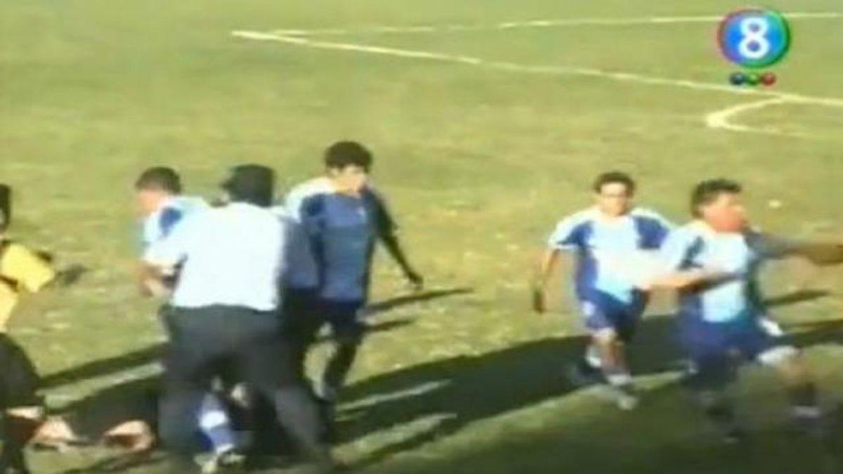 Arjantin Prim Nacional B Ligi'nde Patronato de Parana ile Sportivo Laguna Larga takımları arasında oynanan maçta futbolcular, hakemin bir kararı üzerine sinirlerine hakim olamadı.