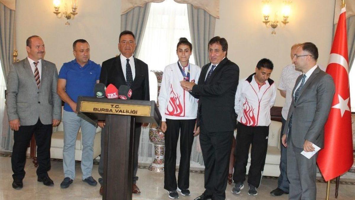 23. Büyükler Dünya Tekvando Şampiyonası’nda 57 kilo büyüklerde dünya 2.’si olan Bursa Sağlık Gücü Gençlik ve Spor Kulübü sporcusu Hatice Kübra İlgün, Bursa Valisi İzzettin Küçük tarafından ödüllendirildi. İlgün, Cumhurbaşkanı Erdoğan’ın daha önce kendisinden dünya derecesi beklediğini söylediğini ve verdiği sözü de yerine getirdiğini belirtti.Dünya Tekvando Federasyonu tarafından 24-30 Haziran 2017 tarihleri arasında Güney Kore’nin Muju kentinde düzenlenen ve 183 ülkeden 971 sporcunun katıldığı 23. Büyükler Dünya Tekvando Şampiyonası’nda Türkiye’yi kadınlar 57 kiloda temsil eden Bursa Sağlık Gücü Gençlik ve Spor Kulübü sporcusu Hatice Kübra İlgün dünya 2.si olmuştu. Başarısından dolayı Bursa Valisi İzzettin Küçük, tarihi Heykel Valilik Binası’nda ağırladığı İlgün’ü ödüllendirdi. Gençlik Hizmetleri ve Spor İl Müdürü Süleyman Şahin de yer aldığı törende Vali Küçük, İlgün’ün büyük bir başarı elde ettiğini belirterek, kendisini ve antrenörünü tebrik etti.Basın mensuplarının sorularını yanıtlayan İlgün, “4-5 ay önce Cumhurbaşkanımız sayın Recep Tayyip Erdoğan ve eşi Emine Hanım buraya gelmişlerdi ve ben o zaman Avrupa 3’üncüsü olmuştum. O zaman bana büyüklerde dünya derecesi ve olimpiyatlarda madalya beklediğini söylemişti. Ben de söz vermiştim. Bu sözümün birincisini gerçekleştirdim. 57 kilo büyüklerde dünya 2.’si oldum. Sırada 2020 Tokyo Olimpiyatları var. İnşallah orada madalya alıp, sözümü gerçekleştireceğim” dedi.