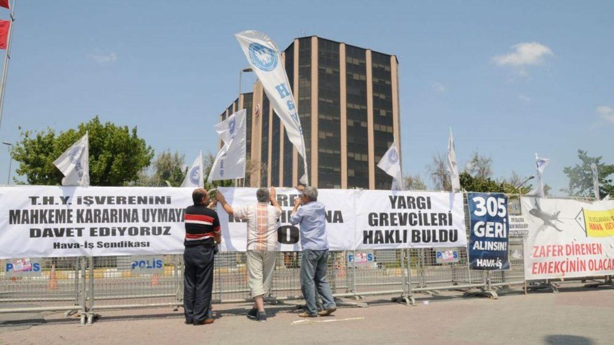 Hava - İş Sendikası üyeleri, İstanbul 5ç İş Mahkemesi'nin greve katılan işçilerin yerine başka işçi çalıştırılamayacağı yönündeki kararını THY Genel Müdürlüğü önünde halaylarla kutladı. Greve katılanlarla ve dışarıdan geleceklerle birlikte 24 saatlik bir uyarı eylemi başlattıklarını belirten Atilay Ayçin, “Yargı yoluyla hakkımızı arama yolunu seçtik. Bilirkişinin tutmuş olduğu raporla THY yönetiminin yaklaşık bin 600 kişinin grev yaptığı bir iş yerinde, grev yokmuş gibi seferlerin normal seyrinde olduğunu gösterme yönündeki çabasını ancak grev kırıcılığı yaparak mümkün olabileceği doğrultusundaki kararını vermiş oldu. Yani THY Yönetimi 6356 sayılı yasada greve çıkan işyerinde greve çıkan işçinin yerinde işçi alamaz. Greve çıkan işçinin işini başka bir işçiye yaptıramayacağı gerçeği çok açık ve anlaşılır şekilde yazıyor. Buna rağmen bu yasa tanımaz hukuk tanımaz tavrı ve tutumuyla şirkete yaklaşık 800 civarında part-time eleman alarak grev kırıcılığı yaptı. Yine grev ve lokavt kapsamı dışında bulunan personeli çalıştırarak grev kırıcılığı yaptı. Sunexpres'den kabin ekibi kiralayarak THY kendi uçaklarında bu ekipleri uçurarak grev kırıcılığı yaptığı ve greve çıkan arkadaşların yerine greve çıkmayan arkadaşları çalıştırarak grev kırıcılığı yaptığı 5'nolu İş Mahkemesi tarafından tescillenmiş oldu.” diye konuştu.
