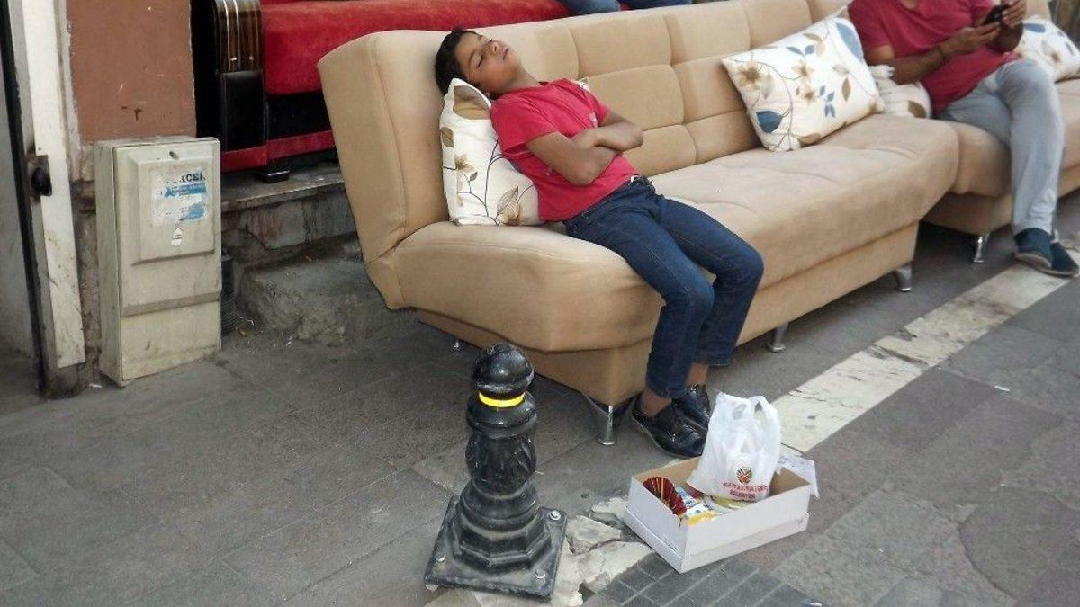 Malatya’da mendil satan Suriyeli çocuk, yorgunluğa dayanamayıp kaldırımda satışa sunulan bir kanepede uyuyakaldı.Ülkelerindeki iç savaş nedeniyle yıllardır mülteci konumunda yaşayan Suriyeliler, zor şartlarda yaşam mücadelesi veriyor. Malatya’da konteyner kent dışında kalan binlerce Suriyeli aile, geçici işler başta olmak üzere bir çok sektörde çalışarak geçiniyor. Suriyeli ailelerin çocukları ise genellikle mendil satarak evlerine katkı sağlamaya çalışıyor. İşte bunlardan biri olan Suriyeli bir çocuk, yorgunluğuna dayanamadı ve Dabakhane Mahallesi Halep Caddesi’nde yoğun araç ve insan trafiğine aldırış etmeden kaldırımda satışa sunulan bir kanepe üzerinde uyuyakaldı.12 yaşlarında olduğu tahmin edilen Suriyeli çocuk, bir süre uyuduktan sonra yeniden mendillerini alarak kalabalığa karıştı.