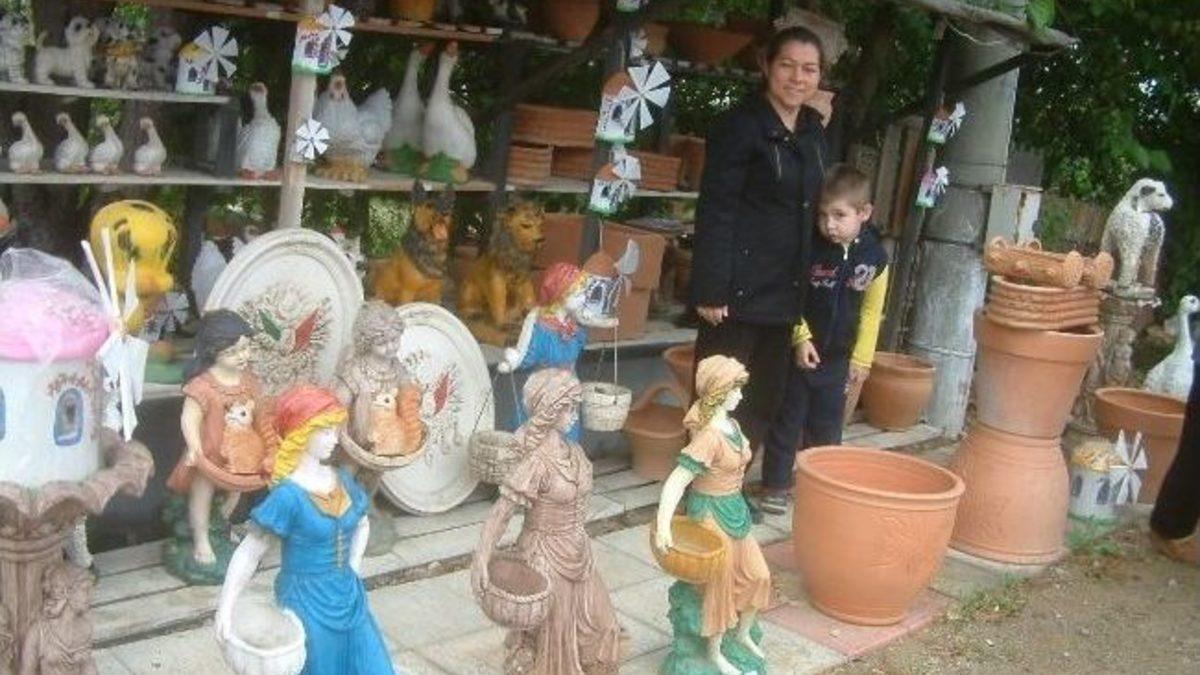 Balıkesir’in Burhaniye ilçesinde, alçıdan yapılmış heykeller ve toprak kaplar Fatma Korkmaz’a geçim kapısı oldu.İskele mahallesinde Çanakla-İzmir Karayolu üzerinde kurduğu stantta çeşitli heykellerle, toprak kaplar ve mangallar satan Korkmaz, işini severek yaptığını anlattı. Burhaniye’de ilçenin içinden geçen Çanakkale-İzmir Karayolu üzerinde start açan vatandaşlar çeşitli ürünler satarken, bir çocuk annesi Fatma Korkmaz da, 7 yıldan bu yana toprak kaplar satıyor. Boy boy toprak saksıların yanı sıra çeşitli heykeller de satan Fatma Korkmaz, “7 yıldan bu yana burada değişik ürünler satıyorum. Ürünlerimiz arasında heykeller, toprak kaplar ve mangallar bulunuyor. Ürünleri, çeşidine göre 5 lira ile 100 lira arasında satıyorum. İşimi severek yapıyorum” dedi.