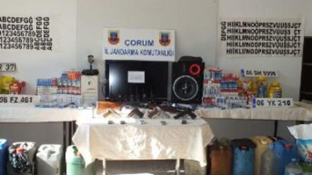 Çorum'da Sinan Ç., Kenan Ç., Mevlüt Ç., Yunus Emre Ö. ve Emre Y., Alaca ilçesi Alacahöyük beldesi İmat mahallesinde işyerinden sigara ve muhtelif gıda maddelerini çalarak Çeşmeören köyünde depo olarak kullandıkları eve getirdikleri sırada İl Jandarma Komutanlığı ekipleri tarafından yakalandı. Şüphelilerin üst ve araçları ile depo olarak kullandıkları evlerinde yapılan aramada, 1027 paket sigara, 1 LCD televizyon, 4 sim kart, 4 cep telefonu, 3 sahte plaka, 7 plastik maske, 8 el telsizi, 1 şarj cihazı, 8 kar maskesi, 63 telsiz pili, 26 eldiven, 2 demir kesme makası, 1 çivi sökme aparatı, 1 ruhsatsız tabanca, 3 kurusıkı tabanca, tabancalara ait 138 fişek, 1 av tüfeği, 1 bilgisayar kasası, 4 bidon içerisinde mazot, 1 matkap ele geçirildi.