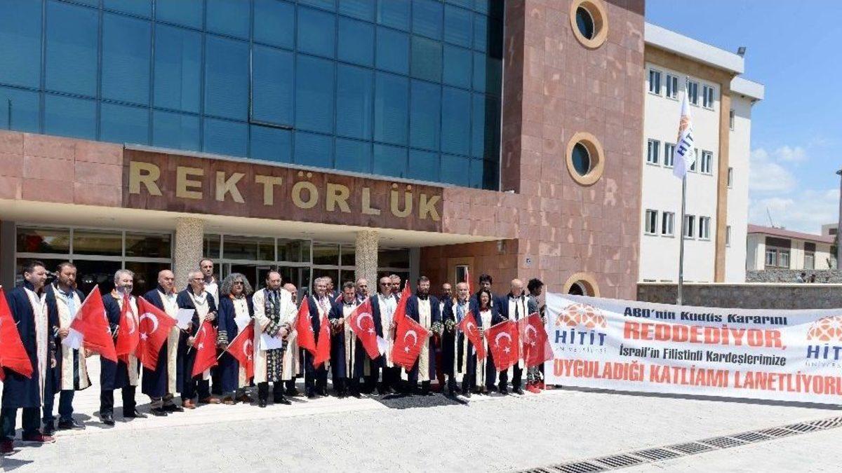 Hitit Üniversitesi Senatosu, İsrail askerlerinin Kudüs’te ABD Büyükelçiliği’nin açılışını protesto eden Filistin halkına yönelik gerçekleştirdiği katliamı kınadı.Rektör Prof. Dr. Reha Metin Alkan başkanlığında olağanüstü toplanan Hitit Üniversitesi Senatosu, İsrail’in Filistinlilere yönelik gerçekleştirdiği katliamı kınama kararı aldı.Senato üyeleriyle birlikte bir basın açıklaması yapan Hitit Üniversitesi Rektörü Prof. Dr. Reha Metin Alkan, Amerika’nın uluslararası hukuk, Birleşmiş Milletler (BM) kararları ile tarihi ve ve sosyal gerçekleri görmezden gelerek büyükelçiliğini Kudüs’e taşıma kararı almak suretiyle Ortadoğu’da istikrarsızlık ve kaosa davetiye çıkardığını, terör devleti İsrail’i de katliama sevk ettiğini söyledi. Prof. Dr. Alkan, bu kararın Nekbe/Felaket gününün 70. yıldönümüne getirilmesinin olayın ne kadar büyük tahrik ve provokasyon içerdiğini gözler önüne serdiğine dikkat çekti.21. yüzyılın ilk çeyreğinde ve Haçlı zihniyeti içerisinde yürütülen katliamın faillerini ve ortaklarını lanetlediklerini dile getiren Alkan, “Masum Filistin halkının, halklarının Siyonist devlet tarafından 10 yıllardır sürekli olarak ihlal edilmesi, en temel özgürlüklerinden mahrum bırakılması ve son olarak bu katliama cüret etmesi karşısında insanlığın gür bir sesle ve topyekün biçimde dur dememesi kabul edilebilir bir durum değildir.tarih bugünleri kara bir leke olarak yazacaktır. Filistin halkı meşru müdafaa hakkına sahiptir. İşgalci konumundaki İsrail ve hamisi ABD Ortadoğu’da mazlum insanlara şiddet kullanmak suretiyle devlet terörü işlemişlerdir. Birleşmiş Milletler ve Lahey Uluslararası Ceza Mahkemesini göreve davet ediyor, eğer uluslararası hukuk varsa ve insanlık bir nebze vicdan sahibiyse bu kurumların Trump ve Netanyahu aleyhinde derhal soruşturma gereğini yapmalarını bekliyoruz” dedi.Masum ve mazlum Filistin halkına başsağlığı dilerken, sadece vatanlarını ve namuslarını savunurken şehit düşen insanların değil hukukun da katledildiğini tüm dünyanın er, geç anlayacağını kaydeden Alkan, vicdan sahibi herkesi ABD ve İsrail aleyhine tavır almaya, haksızlıklarını haykırmaya ve Filistin halkı ile dayanışmak için çağrıda bulundu.