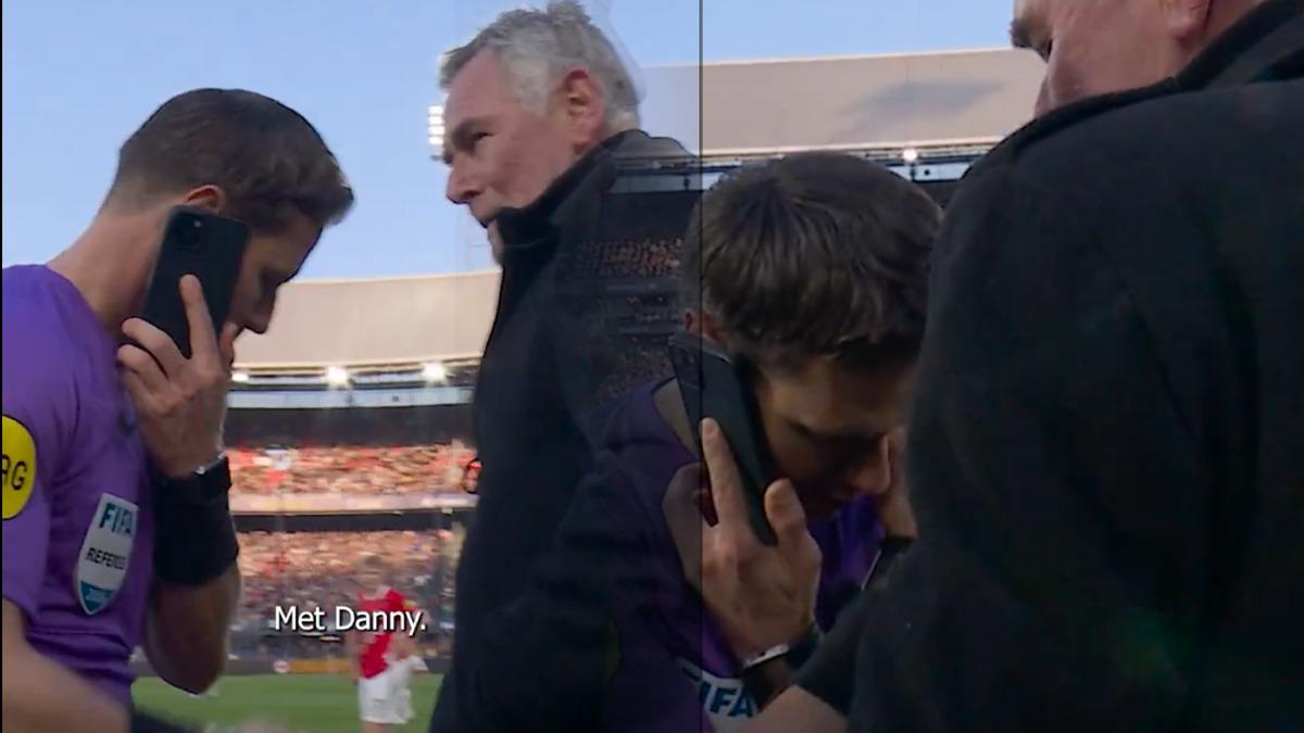Karşılaşmanın oynandığı esnada hakem Danny Makkelie’nin maçı aniden durdurması ve saha kenarına yönelmesi hem tribündeki taraftarları hem de ekran başındaki izleyicileri şoke etti. Çalan telefonunu açan ve bir süre görüşme yapan deneyimli hakem, futbol sahalarında daha önce görülmemiş bir görüntüye imza attı.