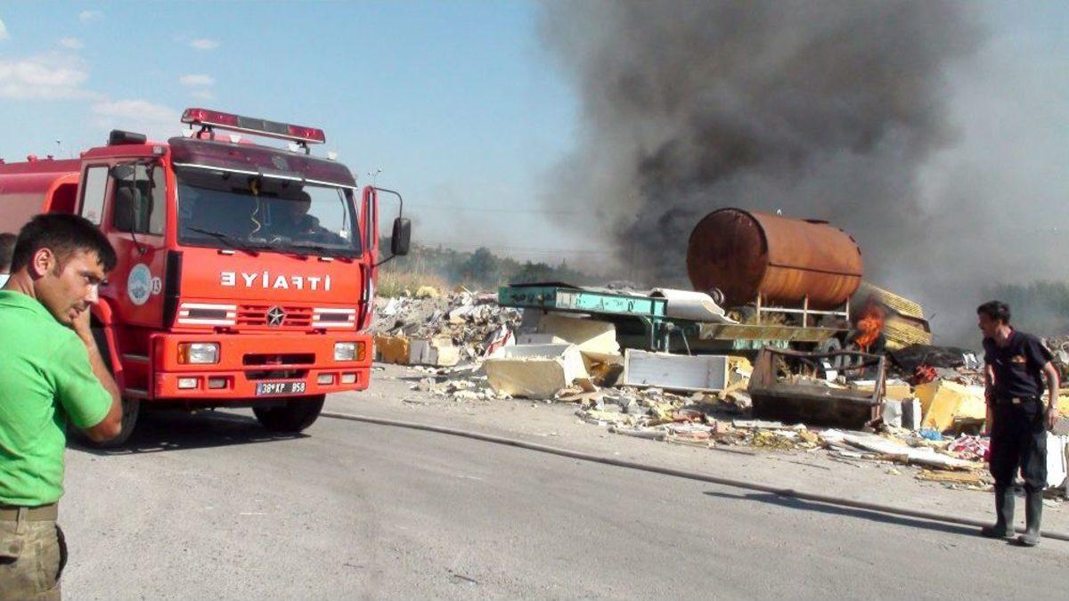 Kayseri Şehirlerarası Otobüs Terminali arkasında bulunan Erciyes Hurdacılar Sitesi'nde yangın çıktı. Rüzgarın da etkisiyle şiddetini zaman zaman artıran yangın, güçlükle kontrol altına alındı.Erciyes Hurdacılar Sitesi’nde bir esnafın hurda kanepeleri yakarak içindeki telleri çıkartmak istemesiyle yangın başladı. Kısa sürede büyüyen yangın, özellikle hurda kamyon kasası ve petrol tankerlerinin bulunduğu bölüme ulaştı. Rüzgarın da etkisiyle sitenin yanındaki ekili araziler, sazlık ve ağaçlık bölüme sıçrayan yangına ilk müdahaleşi esnaf yaptı. Olay yerine gelen itfaiye ekipleri, hurda akaryakıt tankerlerinin patlama riskine karşın polis tarafından güvenlik önlemi alınmasını sağladı. Çok sayıda araçla yapılan müdahale sonucunda yangın, 2 saatlik çalışma sonucu kontrol altına alındı. Daha sonra soğutma çalışması yapıldı.