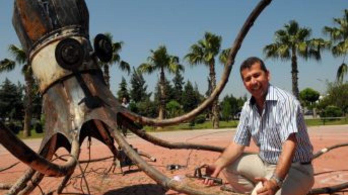 Kullanılamayacak durumdaki her türlü hurda, otomobil parçaları, ağaç ve metal atıkları, estetik ve plastik değerler gözetilerek ustaların ellerinde sanat eserine dönüştü. Heykellerde hurda otobüs mafsalları bacak, ekzantirik mili gövde, bujiler burun, LPG tankları gövde, pistonlar kol, krank kolları el ve ayak oldu. Ustalar tarafından yapılan birbirinden ilginç 10 heykel, Akdeniz Sanayi Sitesi Parkı’nda oluşturulan Atık Malzeme Heykelleri Açıkhava Galerisi’ne konulmaya başlandı. Ahtapot, dinozor, boğa, robot asimodan, çember çeviren çocuk ve zürafaya gibi birbirinden ilginç heykeller görenlerin büyük beğenisini topluyor. Açıkhava galerisi, 13 Haziran saat 17.00’de açılacak.