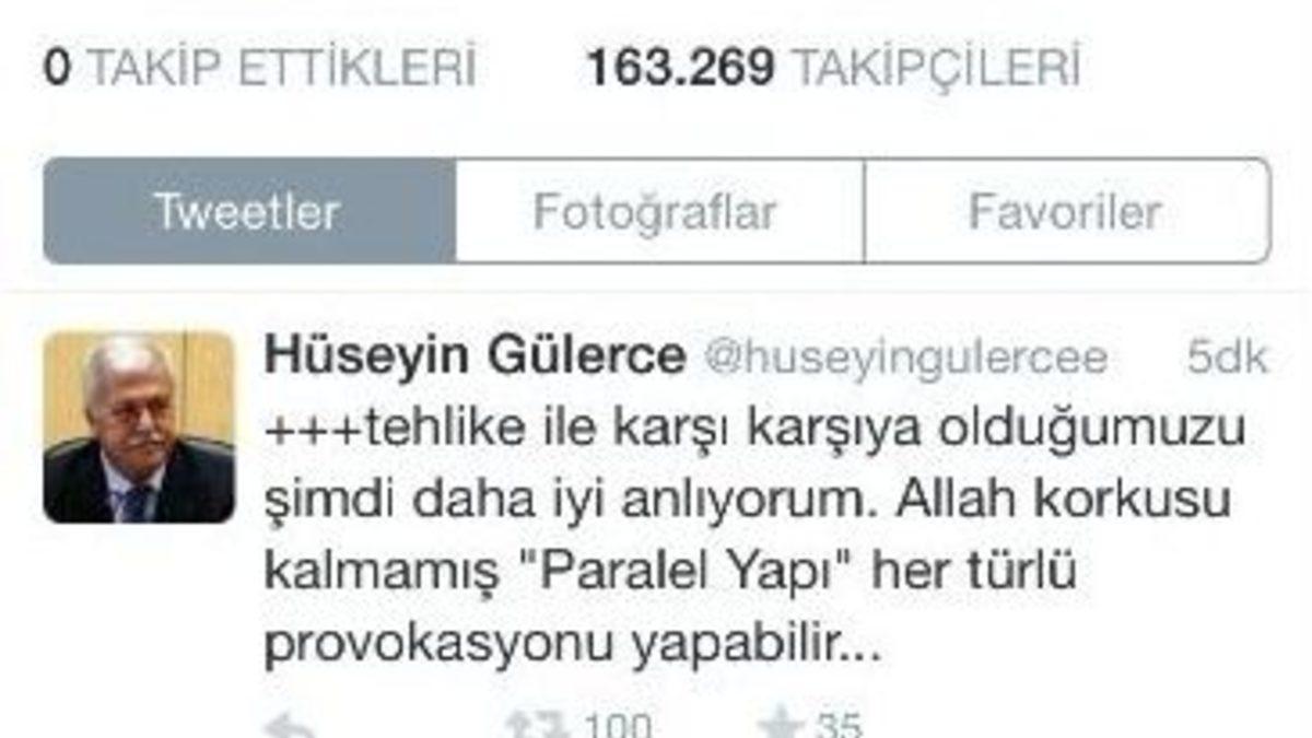 Paralel Yapı iddialarına ilişkin düzenlenen son operasyonda gözaltına alınan ve savcılık ifadesi ardından serbest bırakılan gazeteci Hüseyin Gülerce, twitter hesabından yaptığı açıklamada, "Hayati bir tehdit altındayım" dedi.Sosyal medyadaki paylaşımları ile dikkat çeken Fuat Avni’nin hakkındaki iddialarına yanıt veren Gülerce, "Fuat Avni, son attığı teweetlerde şahsımı hedef göstermektedir. Bu ismin bir şahıs olmayıp Pensilvanya merkezli istihbarat havuzu olduğu kanaati yaygındır. Yalanlara dayanarak benim savcılıkta, esnaf ve iş adamlarının ismini verdiğimi, buna göre yeni operasyon yapılacağını iddia etmektedir. Bu şerefsizce bir yalandır. Pensilvanya beni hedef göstermektedir. Hayati bir tehdit altındayım. Türkiye’nin nasıl bir tehlike ile karşı karşıya olduğumuzu şimdi daha iyi anlıyorum. Allah korkusu kalmamış ’Paralel Yapı’ her türlü provokasyonu yapabilir" ifadelerini kullandı.