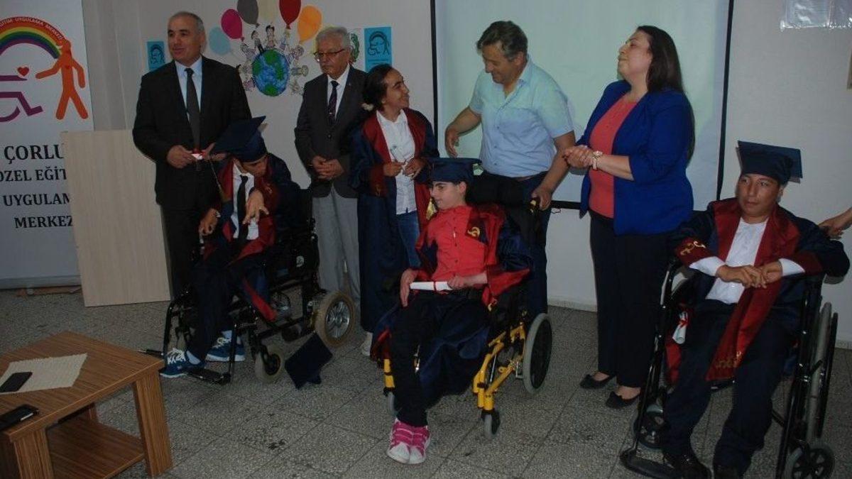 Tekirdağ’ın Çorlu ilçesinde, 2016-2017 eğitim döneminin sona ermesine az bir zaman kala Vehbi Günaştı İlkokulu bahçesinde bulunan binada hizmet veren Çorlu Özel Eğitim Merkezi tarafından öğrenimlerini tamamlayan 4 özel çocuk için karne ve diploma töreni düzenlendi.Çorlu Özel Eğitim Uygulama Merkezinin yemekhanesinde özel çocuklar için düzenlenen diploma törenine Çorlu Kaymakamı Levent Kılıç, Çorlu İlçe Milli Eğitim Müdürü Mustafa Güçlü, okul müdürleri, Çorlu Özel Eğitim Merkezi yöneticileri, öğretmenler, özel öğrenciler ve öğrenci velileri katıldı.Öğrencilerin yıl boyu yaptıkları çalışmalar sırasında çekilen video ve fotoğraflardan oluşan sinevizyon gösterisinin konuklara izletilmesinin ardından Çorlu Kaymakamı Levent Kılıç ve Çorlu İlçe Milli Eğitim Müdürü Mustafa Güçlü tarafından mezun olan özel öğrencilere diplomaları verildi.Etkinlikte konuşan ve bu yıl mezuniyet törenlerine fazla katılamadığını kaydeden Çorlu Kaymakamı Levent Kılıç, “Buradaki programa iyi ki katılmışım ve iyi ki sizlerle bir arada oldum. Özel çocuklarımızın bu mutluluğuna ortak olmak beni de mutlu etti” dedi.“Çorlu Halk Eğitimi Merkezi Kültür Merkezine Taşınacak”Çorlu ilçesindeki özel öğrenciler için bir de müjde veren Kaymakam Kılıç, “Çorlu Kültür Merkezi tamamlandı. Çorlu Halk Eğitimi Merkezi Müdürlüğü yeni yapılan kültür merkezine taşınacak. Daha sonra Çorlu Halk Eğitimi Merkezinden boşalacak bina da özel öğrenciler için bağımsız bir okula dönüştürülecek ve tüm kademelerde eğitim olacak” diye konuştu.