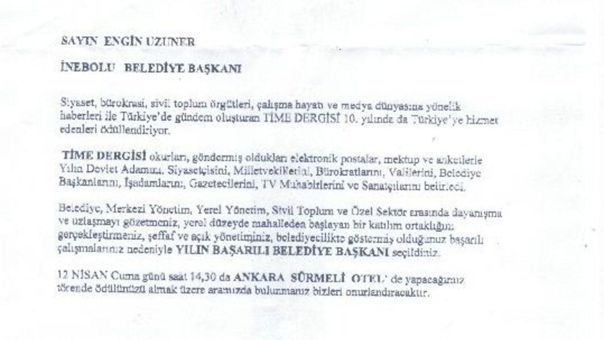 Buna göre düzenlenen yarışmada ‘Yılın Belediye Başkanı’ ödülünü ise İnebolu Belediye Başkanı Engin Uzuner seçildi. Time Dergisi tarafından yapılan açıklamada, “Belediye, Merkezi Yönetim, Yerel Yönetim, Sivil Toplum ve Özel Sektör arasında dayanışma ve uzlaşmayı gözetmesi, yerel düzeyde mahalleden başlayan bir katılım ortaklığını gerçekleştirilmesi, şeffaf ve açık yönetimi ile, belediyecikte göstermiş oldukları başarılı çalışmaları nedeniyle Yılın Başarılı Belediye Başkanı Engin Uzuner seçilmiştir” dendi.