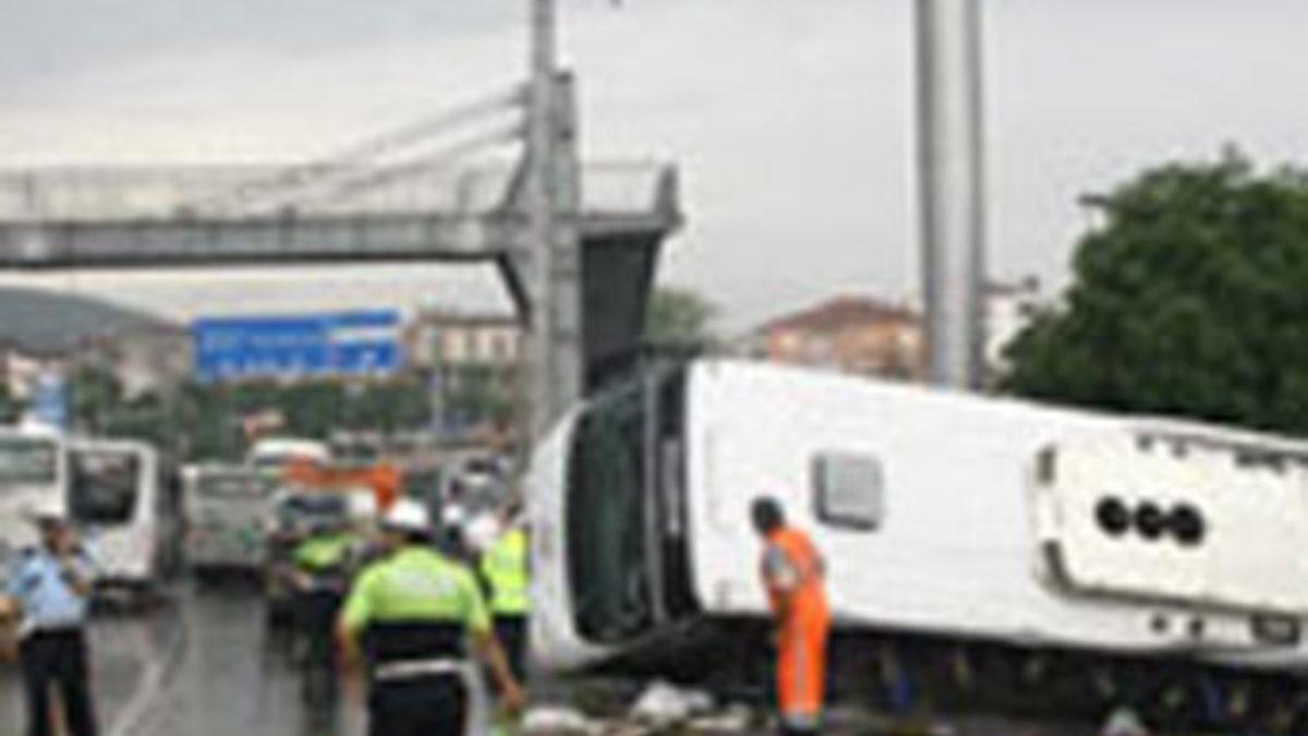 Kaza bugün sabah saatlerinde E-130 Karayolu'nun Değirmendere Yüzbaşılar Kavşağı'nda meydana geldi. Bir fabrikaya işçi servis taşımacalığı yapan Bahri Altınalan yönetimindeki 41 P 1402 plakalı servis midibüsü, sürücünün direksiyon hakimiyetini kaybetmesi sonucu yoldan çıkarak önce orta bariyere çarpı, daha sonra takla atıp yan yattı.