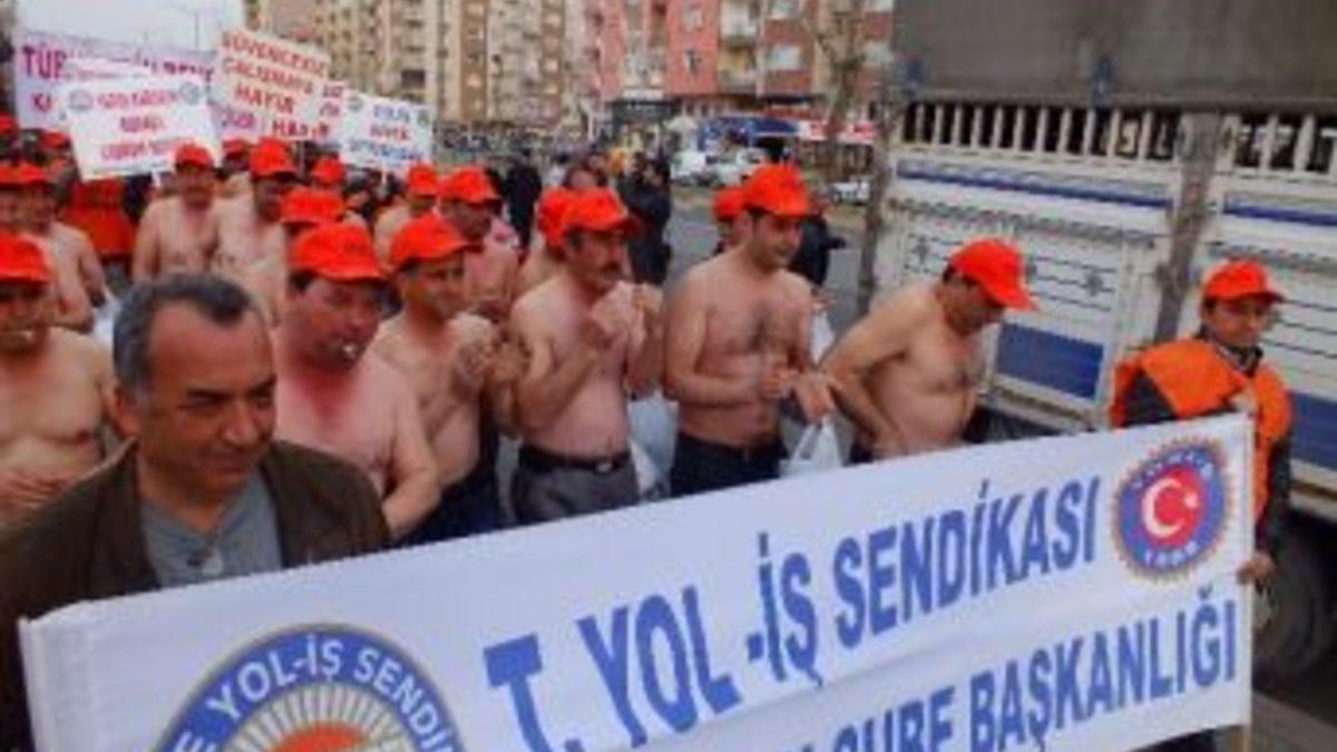 Kütahya’da Yol-İş Sendikası'na bağlı işçiler soyunarak eylem yaptı.Yol-İş Sendikası'na bağlı işçiler giysilerini çıkartarak, Eski Otogar önünden Atatürk Bulvarı'ndan şehir merkezine doğru yürüyüşe geçti. Yol-iş Sendikası Bursa Şube Başkanı Muharrem Yıldız, Kütahya Zafer Meydanı'nda yaptığı açıklamada, taşeron işçilerin Karayollarında zenci diye hitap edildiğini söyledi. 2 yıldır hukuk mücadelesi verdiklerini anlatan Yıldız, “Türkiye Cumhuriyeti yargısının en üst noktasından Yargıtay’dan aldığımız ‘Bu işçiler Karayolları Genel Müdürlüğünün bir çalışanıdır’ kararına rağmen, 2 yıldır kapısını çalmadığımız yetkili kalmadı. Her gittiğimiz kurum yargının verdiği karar doğrudur siz haklısınız, kadroyu kazandınız dedikleri halde kadroyu vermemek için her yolu deniyorlar” dedi.Yarın Türk-İş ile birlikte Ankara’da Sıhhiye Meydanı'nda köleleşmeye ve taşeronlaşmaya hayır mitingi yapacaklarını hatırlatan Yıldız, “Türkiye Yol-İş sendikası olarak bu mitinge 81 vilayetten 30 bin çalışanımızla çıplak ve yayan olarak yola çıktık” ifadelerini kullandı.