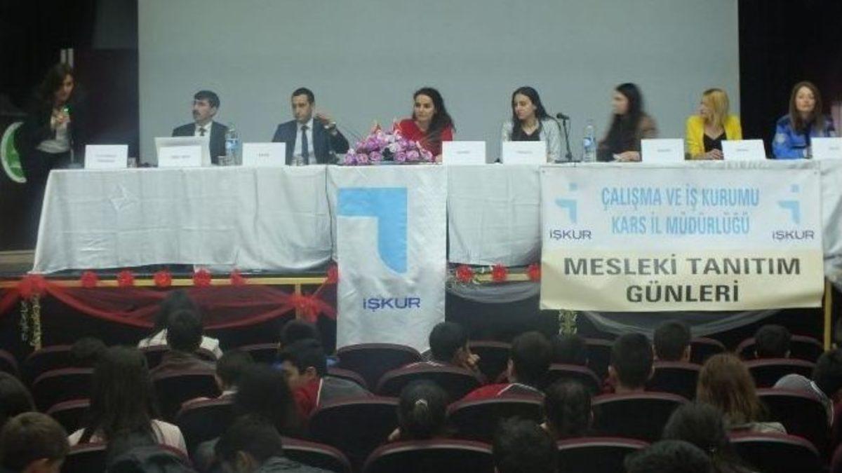 Kars Çalışma ve İş Kurumu İl Müdürlüğü, ‘Mesleki Tanıtım Günleri’nde, öğrencilere ileride seçecekleri meslekler konusunda yardımcı oluyor.Kars İŞKUR Müdürlüğü’nce Halk Eğitim Salonu’nda düzenlenen Tanıtım Günleri’ne, İŞKUR İl Müdür Yardımcısı Bülent Bulut, İş ve Meslek Danışmanı Tuğba Toprak, Doktor Ceyda Şahhan, Savcı İbrahim Şaşdım, Mimar Tuğba Şenol, Polis Eda Sayıcı Haklı, Avukat Çiğdem Kadiroğulları, Psikolog Şeyma Namçok, kurum yetkilileri ve öğrenciler katıldı.Lise 8-9 ve 11 ve 12’inci sınıf öğrencilerinin katıldığı tanıtım günlerinin açılış konuşmasını İŞKUR İl Müdür Yardımcısı Bülent Bulut, yaptı.Programda daha sonra katılımcılar kendi meslekleri dalında öğrencilere bilgiler verdi. Katılımcılar öğrencilere meslekleri ile ilgili bir de sunum yaptılar. Program sonunda öğrenciler tarafından sorulan sorular, katılımcılar tarafından cevaplandırıldı.