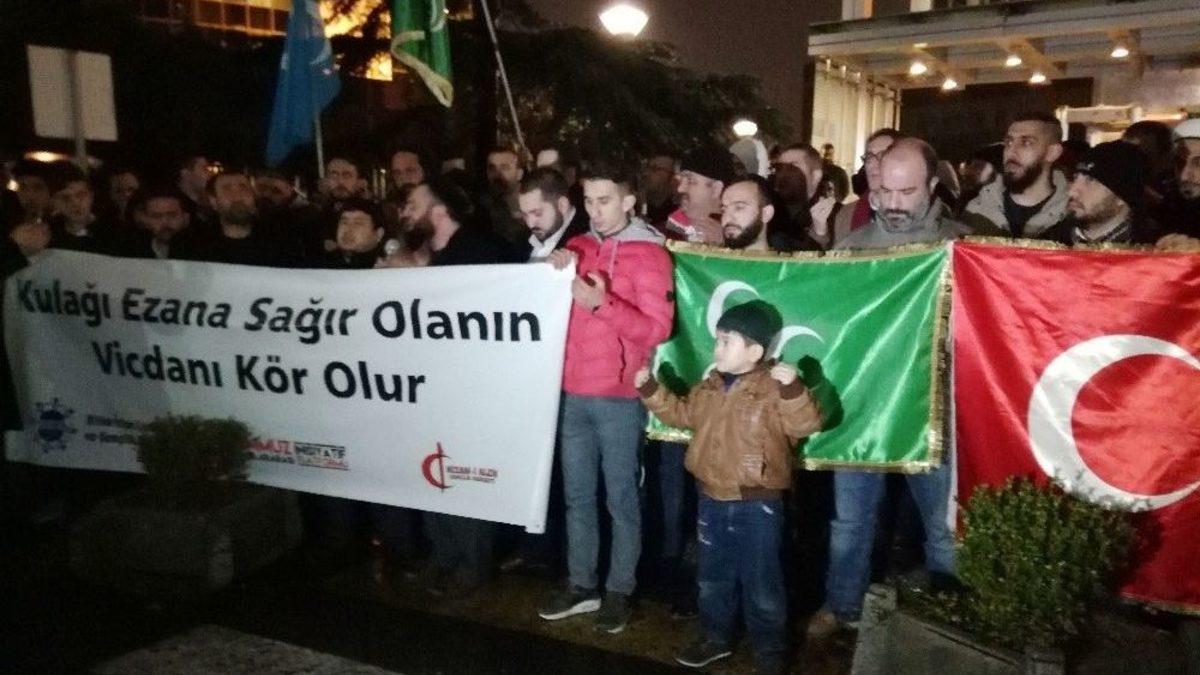 Bilim, İrfan, Liyakat Derneği (BİLGENÇ) ile Nizam-ı Alem Gençlik Hareketi üyeleri İsrail’de ezan okunmasının yasaklanmasını İsrail Konsolosluğu önünde protesto etti.BİLGENÇ ile Nizam-ı Alem Gençlik Hareketi üyesi yaklaşık 50 kişi İsrail Konsolosluğu önünde toplanarak İsrail’de 23.00 ile 07.00 saatleri arasında hoparlörlerle ezan okunmasının yasaklanmasını protesto etti. Levent’te bulunan İsrail Başkonsolosluğu’na sloganlar atarak yürüyen grup, ellerinde Türk bayrağı, Doğu Türkistan bayrakları ile gelerek, konsolosluk önünde ezan okudu. Polisin konsolosluk binası önünde önlem aldığı görüldü. Ezan okunmasının ardından dualar edildi. Basın açıklaması yapan grup daha sonra konsolosluk önünden ayrıldı.