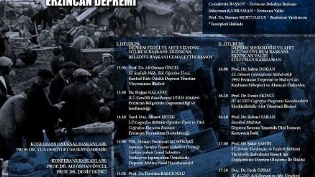 1939 Erzincan Depreminin 75’nci yıl dönümünde İstanbul Üniversitesi İlahiyat Fakültesi Konferans Salonunda Mimar ve Mühendisler Grubu tarafından “75. Yılında Erzincan Depremi” konulu deprem konferans düzenleneceği öğrenildi.Yurt içi ve yurt dışındaki çeşitli üniversitelerden alanlarında uzman öğretim görevlilerininde katılacağı konferansta “Deprem Fiziği ve Afet Vizyonu” ve “Deprem Sosyolojisi ve Afet Eğitimi” başlıklarında olmak üzere 2 oturum olarak 26 Aralık 2014 Cuma tarihinde 10.00-18.00 saatleri arasında gerçekleşeceği konferansın ise ilk oturum başkanlığını Erzincan Belediye Başkanı Cemalettin Başsoy, ikinci oturumunun ise Erzincan Valisi Süleyman Kahraman’ın başkanlığında gerçekleşeceği belirtildi.Yapılacak olan oturumda 1992 Erzincan depremi ve mal ve can kaybının sebepleri ve alınacak önlemleri, sürdürülebilir afet yönetim ilkeleri, deprem sonrası yaşamda dini inancın koruyucu rolü, Türkiye’de kabuktaki sismik hız değişiminin deprem oluşumu ile ilişkisi, depremin getirdiği sosyolojik değişim ve sorunlar hakkında katılımcılara bilgi verileceği öğrenildi.Konferansın vatandaşları deprem konusunda bilinçlenmesi açısından önemine değinen Vali Kahraman, İstanbul’da yaşayan tüm Erzincanlı vatandaşları konferansa davet etti.