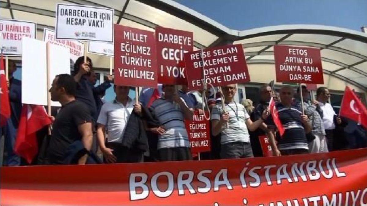 Duruşma salonu önünde ellerinde Türk bayraklarıyla toplanan grup, "Darbeye geçit yok", "Millet eğilmez Türkiye yenilmez", "Vatan aşkı rütbe değil yürek işidir", "Darbecilere idam" yazılı dövizler taşıyarak, "İdam isteriz" sloganları attı.