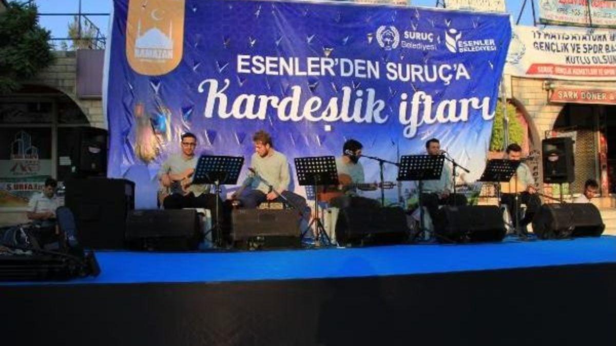 Şanlıurfa'nın Suruç ilçesinde düzenlenen iftar programına katılan yaklaşık 3 bin vatandaş Esenler Belediye Başkanı M. Tevfik Göksu, Şanlıurfa Büyükşehir Belediye Başkanı Nihat Çiftçi ve Suruç Kaymakamı ve Belediye Başkan Vekili Ferhat Sinanoğlu ile birlikte aynı iftar sofrasında yer almanın keyfini yaşadı. Konser gösterisiyle başlayan programda Esenler Belediyesi tarafından getirilen kumanyalar dağıtıldı. Suruçlular ezanın okunmasıyla oruçlarını açtı.