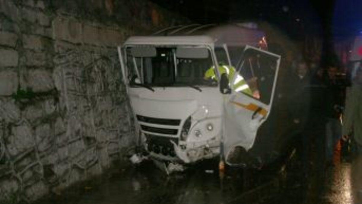 İzmir'in Konak ilçesinde, yağmurlu havada kontrolden çıkan servis minibüsü istinat duvarına çarptı. Sürücü Selçuk Duran (47) araç içinde sıkışarak yaralandı.