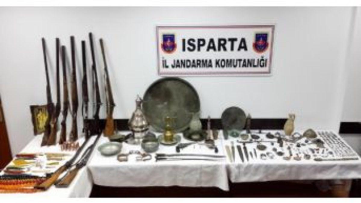 Ali ÇEVİKBAŞ/ISPARTA, Isparta Jandarma Komutanlığı ekipleri Gelendost İlçesi'nde H.A.'nın elinde bulundurduğu tarihi eserleri satmaya çalıştığı ihbarı üzerine harekete geçti. H.A.'nın işyerine baskın yapan jandarma ekipleri yaptıkları aramada; seri numarasız, çakmaklı, namludan doldurmalı eski dönemlere ait çift namlulu 8 tüfek, 113 sikke, 2 kılıç, 3 kama, 2 köstekli cep saati, madalya, 8 heykel, mühür, yüzük, el terazileri ve 75 adet muhtelif eski eser olmak üzere toplam 243 malzeme ele geçirdi.