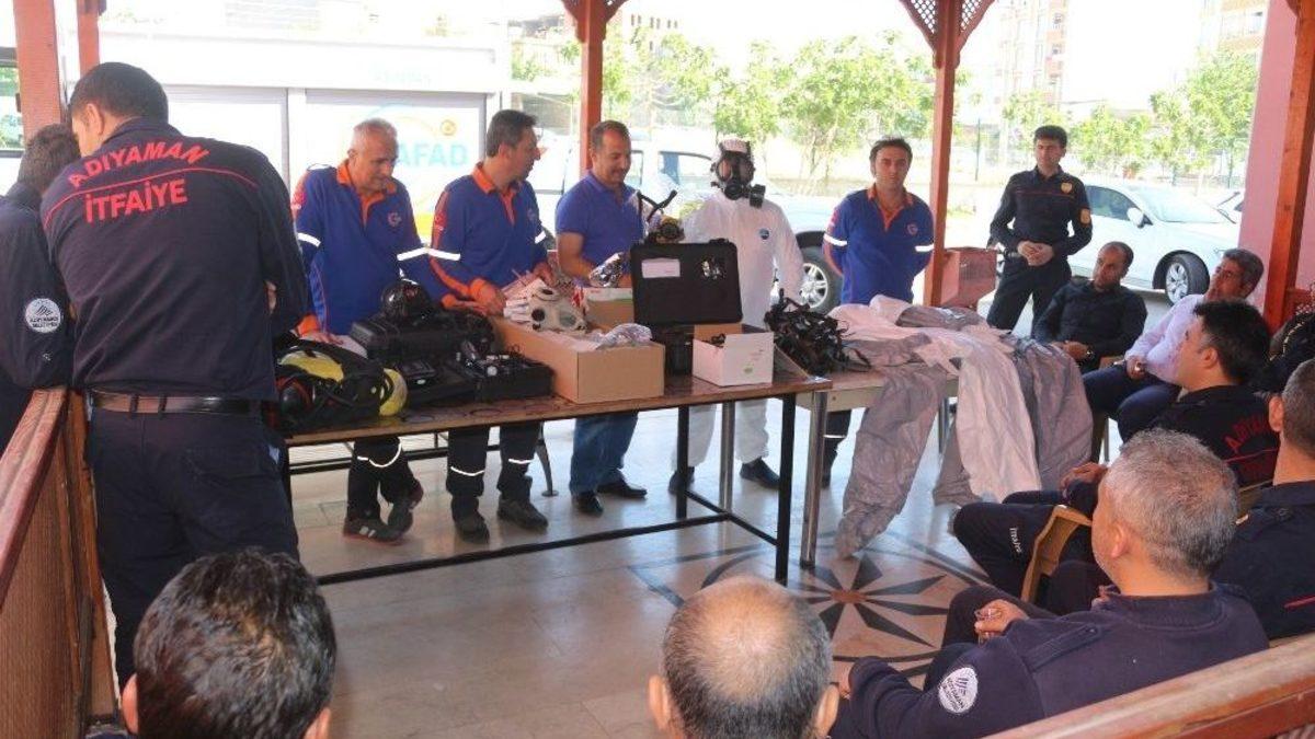 Adıyaman Belediyesi İtfaiye Müdürlüğü personellerine yönelik KBRN eğitimi verildi.İtfaiye Müdürlüğü bahçesinde 2 gün boyunca sürecek olan KBRN eğitimlerinde itfaiye erlerine Adıyaman AFAD Müdürlüğü görevlileri hem malzeme tanıtımları hem de yaşanabilecek kimyasal ve biyolojik olaylarda yapılması gerekenler tek tek anlatıldı.Verilen eğitimlerle alakalı açıklamalarda bulunan İtfaiye Müdürü Ahmet Çelik, “Biliyorsunuz dünyanın gündemi şuanda çok karışık. Hemen yanı başımızda nükleer silahlar, kimyasal silahlar, biyolojik silahlar kullanılıyor. Bu nedenler orta doğuya yakın bütün illerin hazırlıklı olması gerekmektedir. Bizde bu hazırlıklar kapsamında Adıyaman AFAD İl Müdürlüğümüzle birlikte kimyasal, biyolojik, radyoaktif ve nükleer silahlara karşı nasıl korunacağımızı, halkı nasıl bilinçlendireceğimize yönelik eğitimler alıyoruz. Bu eğitimlerimiz inşallah devam edecek” diye konuştu.