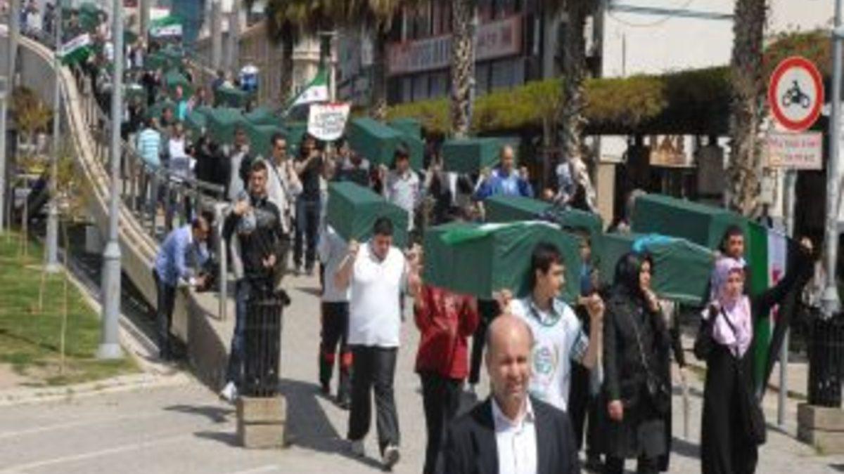 İzmir'de bazı derneklerin biraraya gelerek oluşturduğu İzmir Sivil Toplum Kuruluşları Platformu, Suriye'de yaşanan insanlık dramını "Suriye için tabutlarla ölümü değil, özgürlüğü taşıyoruz" sloganıyla protesto etti. Çok sayıda, gerçeğiyle birebir ölçüde hazırlanmış maket tabutlar taşıyan grup, Esed rejiminin öldürdüğü Suriyeliler için de gıyabi cenaze namazı kıldı. İzmir Sivil Toplum Kuruluşları Platformu üyeleri, Basmane Tren Garı önünde toplanarak taşıdıkları maket tabutlarla tekbir ve sloganlar eşliğinde Konak Meydanı'na yürüdü. Taşıdıkları tabutları Konak Camisi önüne koyan grup, öğle namazının ardından Esed rejiminin öldürdüğü Suriyeliler için gıyabi cenaze namazı kılarak dua etti. Hayatını kaybedenler için Kur'ân okundu. Telefon bağlantısı yapılan Suriye Ulusal Konseyi Türkiye Temsilcisi Halit Hoca, İzmir'de Suriye halkına destek verenlere teşekkür etti. Daha sonra grup adına basın açıklaması okuyan Av. Halit Çelik, Suriye'de yaşanan insanlık dramını, dünyanın boş gözlerle seyrettiğini söyledi. Katliamın boyutunun her geçen gün arttığını ifade eden Çelik, "Beşşar Esed, kendi halkına karşı acımasız bir soykırım siyaseti icra ediyor. Şehirler tanklarla, füzelerle, ağır silahlarla bombalanırken savunmasız siviller vahşice katlediliyor. İzmirli sivil toplum kuruluşları olarak Suriyeli kardeşlerimizin maruz kaldığı bu sistematik vahşetten ötürü büyük bir acı ve öfke, yükselen direnişle ise onur duymaktayız." dedi. Suriye yönetiminin oyalama taktiklerini bir an önce bırakması gerektiğinin altını çizen Çelik, baskı ve zulüm politikalarına son verilmesi, halkın özgürlük ve adalet taleplerinin gereği olan düzenlemelerin vakit geçirilmeden hayata geçirilmesi gerektiğini söyledi. Suriye'ye dış müdahale senaryolarına karşı olduklarını da ifade eden Çelik, Suriye rejimini de halkına silah doğrultmuş rejim görüntüsünden bir an önce sıyrılmaya, akılsız ve basiretsiz politikalarla ülkeyi emperyalist güçlerin manipülasyonlarına açık hale getirmekten kaçınmaya davet etti. Suriye'de Esed rejiminin elinde bulunan gazeteciler Adem Özköse ve kameraman Hamit Coşkun'un bir an önce serbest bırakılarak ailelerine kavuşmasını istediklerini de belirten Çelik, ilgili bütün kurum ve yetkilileri harekete geçemeye çağırdı. "İşkence, zulüm, Esed, kahrolsun Esed", "Katil Esed Suriye'den defol" ve "Katil Esed sonun Mübarek olsun" gibi sloganlar atan grup, duanın ardından olaysız şekilde dağıldı.
