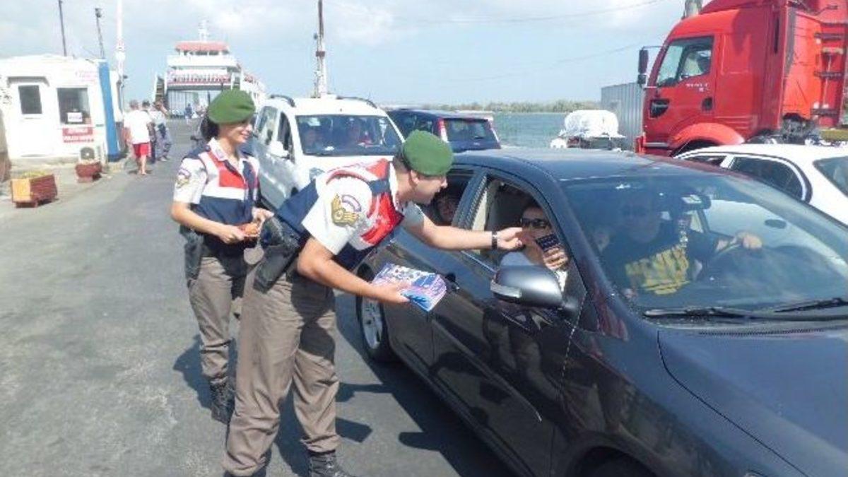 Ramazan bayramı sona ermesine rağmen kara yollarındaki yoğunluk sürüyor. Çanakkale'nin Lapseki ilçesi ile Çardak feribot iskelesinde jandarma ekipleri tatilcileri çikolata ve şekerle uğurluyor.Çanakkale İl Jandarma Komutanlığı'na bağlı Jandarma Trafik Timleri, Ramazan Bayramı sonrasında Lapseki ilçesi, Çardak feribot iskelesinde hem trafik kontrolü yaptı, hem de sürücülere çikolata ve şeker ikram etti. Trafik Tim Komutanı J.Astsubay Murat Dilek, tim personelleri J.Astsubay Gizem Yaşar ve Uzm.J.Çvş. Ufuk Kara ile birlikte vatandaşlara tatil dönüşlerinde çikolata ve şeker ikram edip, Çanakkale İl Jandarma Komutanlığı tarafından özel olarak hazırlatılan trafik bilgilendirme broşürü dağıttılar. Sürücülere trafik kuralları hakkında uyarılarda bulunan jandarma personeli yaptıkları bu uygulama ile vatandaşların sempatisini kazandılar.Bayram sona ermesine rağmen yoğunluğun devam ettiği kara yollarında jandarma trafik timleri tarafından denetimlerin süreceği belirtildi. Lapseki ilçesinde kara yolu üzerinde oluşan uzun trafik kuyruğunu kontrol altına alan jandarma ekipleri bir yandan da tatilcileri şeker ve gürler yüzle uğurlaması vatandaşları memnun etti.