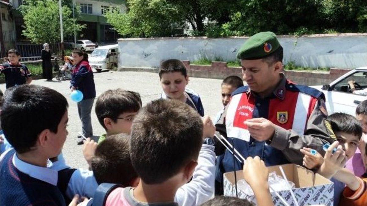 Bartın Jandarma Trafik ekipleri karne alan öğrencilere karne hediyesi olarak şapka ve balon dağıttı.