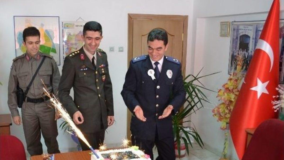 Konya’nın Seydişehir İlçe Jandarma Komutanlığı, Türk Polis Teşkilatı’nın 169. Kuruluş Yıldönümü’nü kutlayan Seydişehir İlçe Emniyet Müdürlüğü’ne üzerinde Emniyet Genel Müdürlüğü’nün logosunun bulunduğu pastayla sürpriz yaptı.Kuruluşunun 175. yılında yaptığı sosyal projeler ile adından sıkça söz ettiren Seydişehir İlçe Jandarma Komutanlığı kardeş kurumu emniyet müdürlüğünü de unutmayarak yaptırdıkları üzerinde Emniyet Genel Müdürlüğünün logosunun bulunduğu pasta hazırlattı. Emniyet Müdürlüğüne getirilen pasta İlçe Jandarma Komutanı Mehmet Oyanık ile İlçe Emniyet Müdürü Ali Gürbunar tarafından kesildi. Ziyarette konuşan İlçe Jandarma Komutanı Mehmet Oyanık, halkın güvenliği ve huzuru için çalışan iki kardeş kurum olduklarını söyleyerek, “Bu özel günlerinde onların mutluluğuna ortak olmak istedik. Ben Emniyet Müdürümüz nezdinde tüm emniyet teşkilatı mensuplarımızın gününü kutluyorum” dedi.Emniyet Müdürü Ali Gürbunar ise, ziyaretten duyduğu memnuniyeti dile getirerek, “Komutanlarımıza bu ince düşüncelerinden dolayı teşekkür ediyorum. Bu güne kadar ilçemizde jandarmamız ile birlikte birçok güzel işe imza attık ve atmaya da devam edeceğiz. Bu özel günümüzde de bizleri unutmayarak yaptıkları bu jest için kendilerine teşekkür ediyorum” diye konuştu.