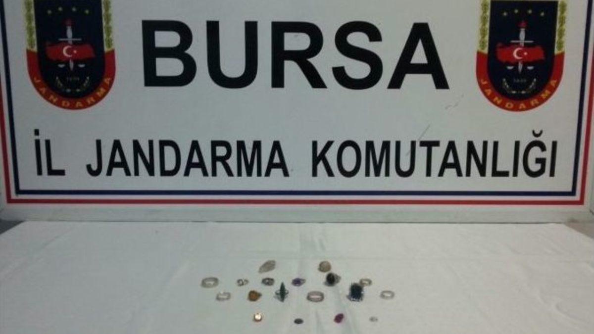 Bursa İl Jandarma Komutanlığı ekipleri, son 3 ayda tarihi eser kaçakçılarına büyük darbe indirdi. Bir ihbarı değerlendiren ekipler, 3 kişiyi tarihi eser kaçakçılığı suçundan gözaltına aldı.İl Jandarma Komutanlığı ekipleri, gelen bir ihbarı değerlendirerek tarihi eser kaçakçılarının peşine düştü. Yapılan teknik ve fiziki takip sonrası savcılıktan alınan izinle bir alışveriş merkezinde gözaltına alınan H.U., Ş.G. ve T.S. Ovaakça Jandarma Komutanlığına götürüldü. Zanlıların yapılan üst aramasında tarihi eser vasfı taşıyan 12 adet yüzük ve 6 adet pırlanta taş bulundu. Ele geçirilen tarihi eserler müzeye gönderildi. Yakalanan zanlılardan bir tanesi yapılan sorgusunun ardından serbest bırakılırken, diğer iki zanlının sorgusunun devam ettiği öğrenildi.SON 3 AYDA BÜYÜK DARBEJandarma ayrıca son 3 ay içerisinde ele geçirilen tarihi eserlerin listesini de yayınladı. 11 bin 745 adet sikke, 12 adet bilezik, 19 adet yüzük, 2 adet gözyaşı şişesi, 3 adet heykel, bir adet pelerin, bir adet Tevrat, bir adet kılıç, 82 adet muhtelif tarihi eser, ele geçirilirken 19 zanlı da gözaltına alındı. Zanlıların eserleri kaçırmada ve toprak altıdan çıkarmada kullandığı bir çalıntı araç, bir tabanca ve şarjör ile 10 fişek ve kazı malzemeleri de ele geçirilerek muhafaza altına alındı.