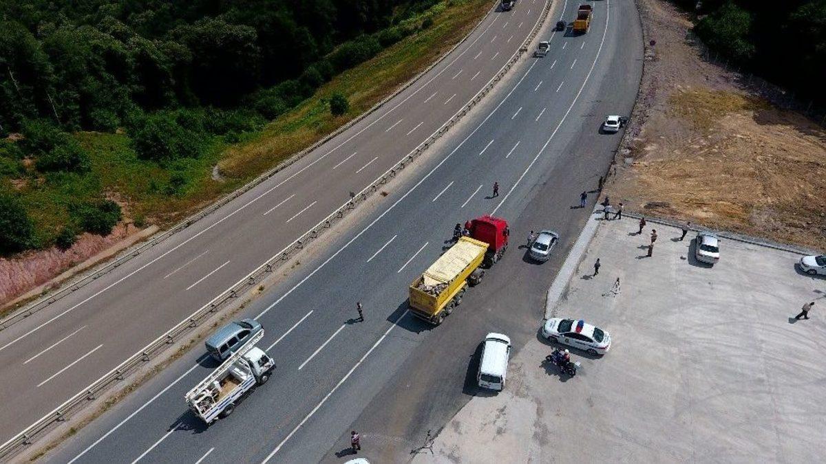 Jandarma ekipleri Şile yolu üzerinde hafriyat kamyonlarına yönelik uygulama yaptı. Ekiplerin drone kullanarak yaptığı uygulama, havadan görüntülendi.Jandarma ekipleri Şile yolu Gözlemeciler Mevkisinde hafriyat kamyonlarına yönelik uygulama yaptı. Uygulamalar sırasında jandarma havadan drone kullanırken yerden de motorize ekiplerden destek aldı. Drone yardımıyla sürücüler havadan izlenerek kural ihlali yapanlar tespit edildi. Şerit ihlali ve aşırı sürat başta olmak üzere kurallara uymayan sürücüler uygulama noktasına çekildi. Burada kontrolden geçirilen sürücülerin mesleki yeterliliği olup olmadığı incelendi. Kurallara uymayan ve mesleki yeterlilik belgeleri olamayan sürücülere cezai işlem uygulandı.Öte yandan, ekiplerin uygulama yaptığı anlar ise havadan görüntülendi. Görüntülerde hafriyat kamyonlarının durdurulması ve kontrolden geçirilmesi yer aldı.